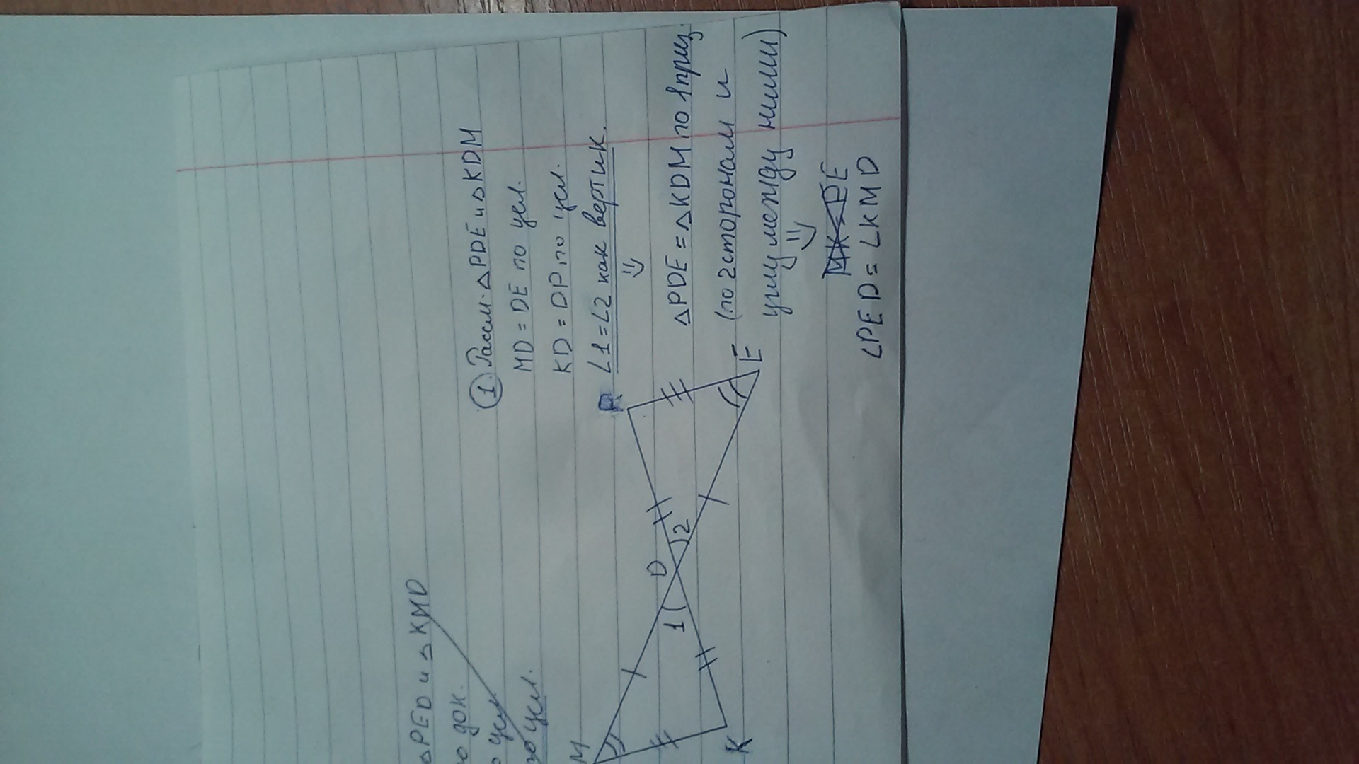 отрезки Ме и Рк пересекаются в точке Д являющаяся серединой каждого из них. докажите что РДЕ равен КДМ
