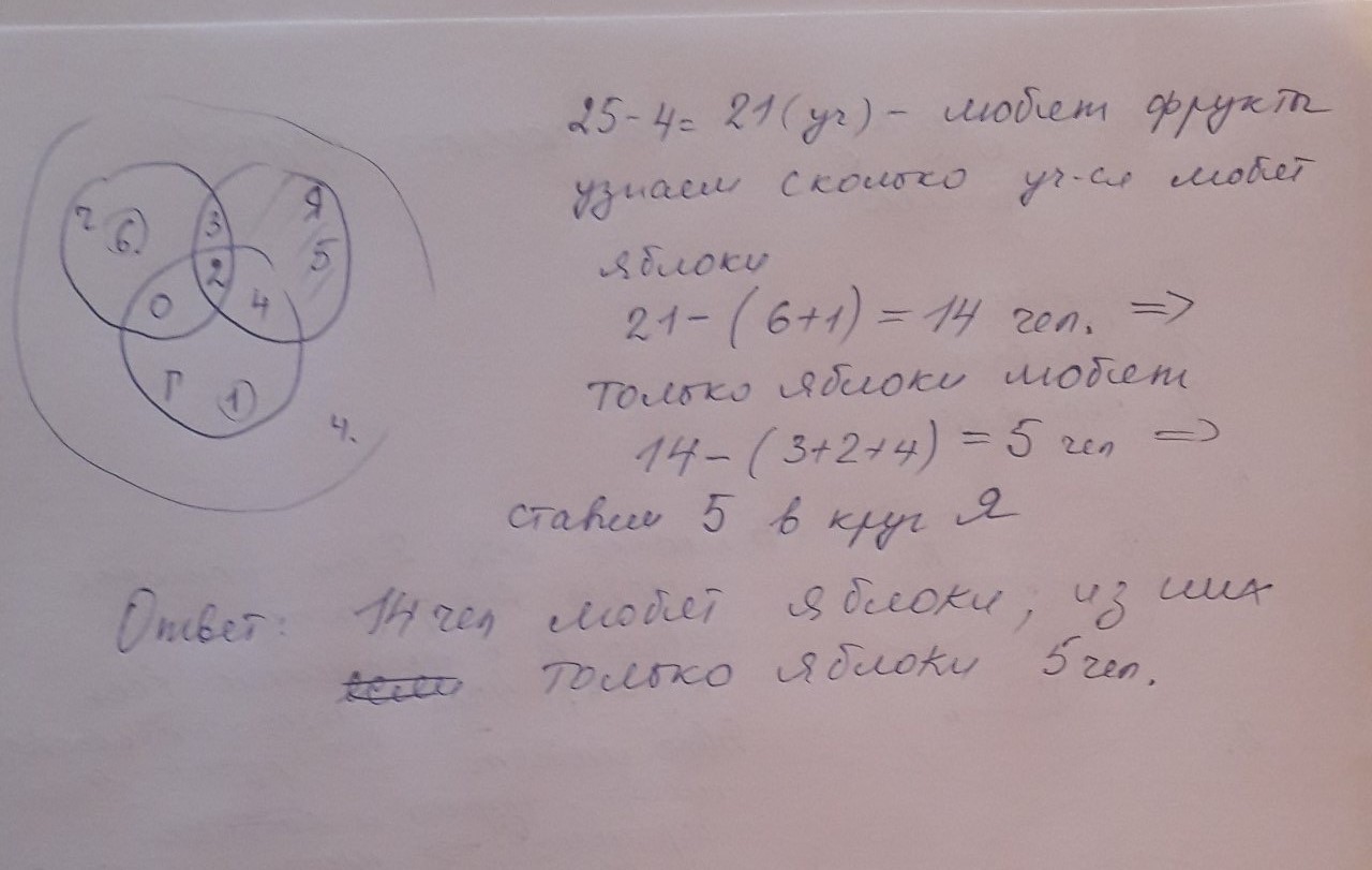 7)25-4=21 человек любят фрукты.Узнаем,сколько учеников любят яблоки,из любителей фруктов вычтем любителей черешни и груш,21-(Ч+Г),то что записали в круги Ч и Г.