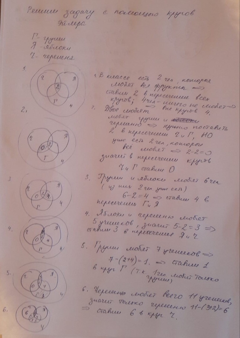 1)В классе есть 2 человека,которые любят все фрукты.Ставим 2 в пересечение всех кругов.4 человека ничего не любят.Ставим 4 вне всех кругов.