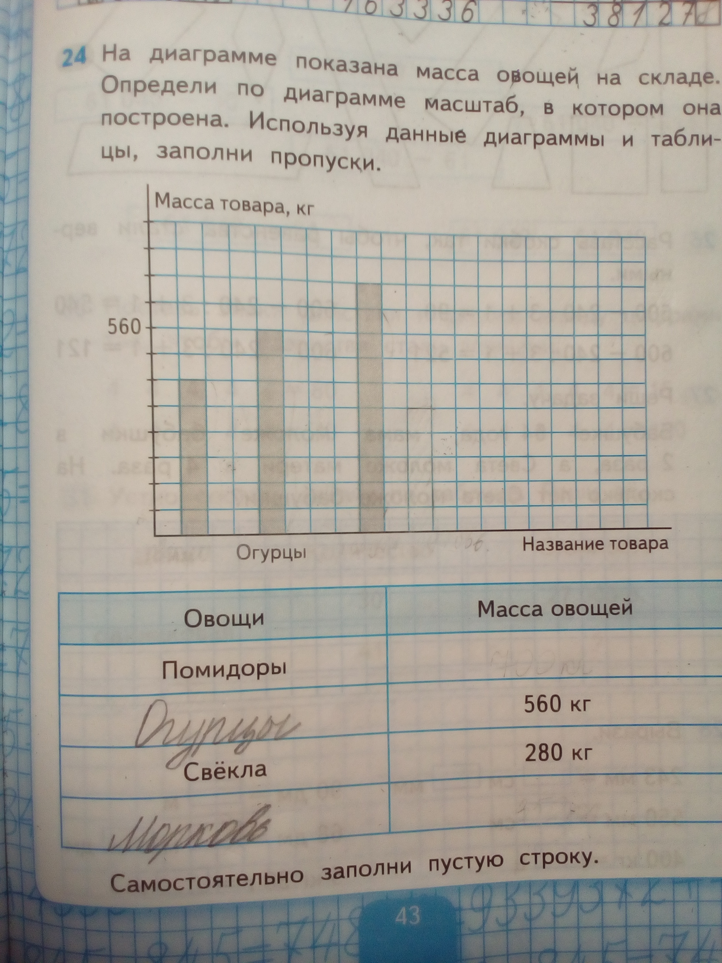 На Диаграмме показана масса овощей на складе. Определи по диаграмме масштаб, в котором она построена. Используя данные диаграммы и таблицы, заполни пропуски.