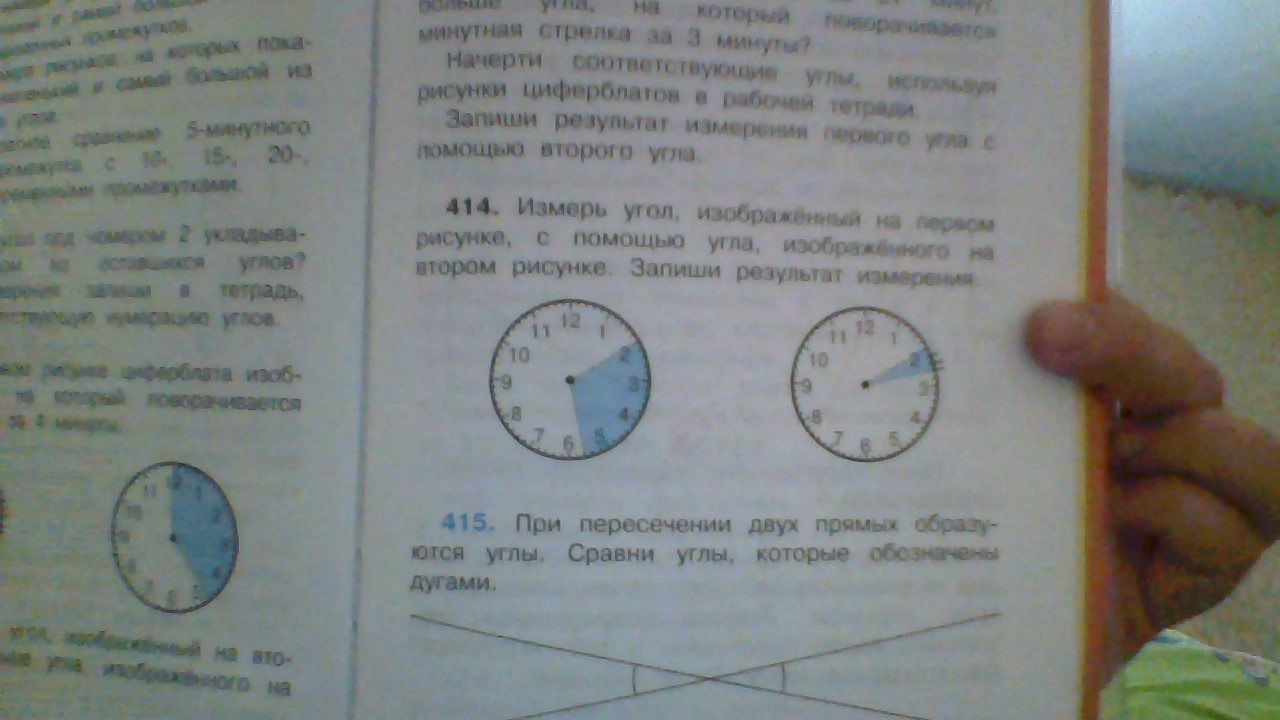 измерь угол, изображенный на первом рисунке, с помощью угла изображенного на втором рисунке.Запиши результат измерения и номер №415