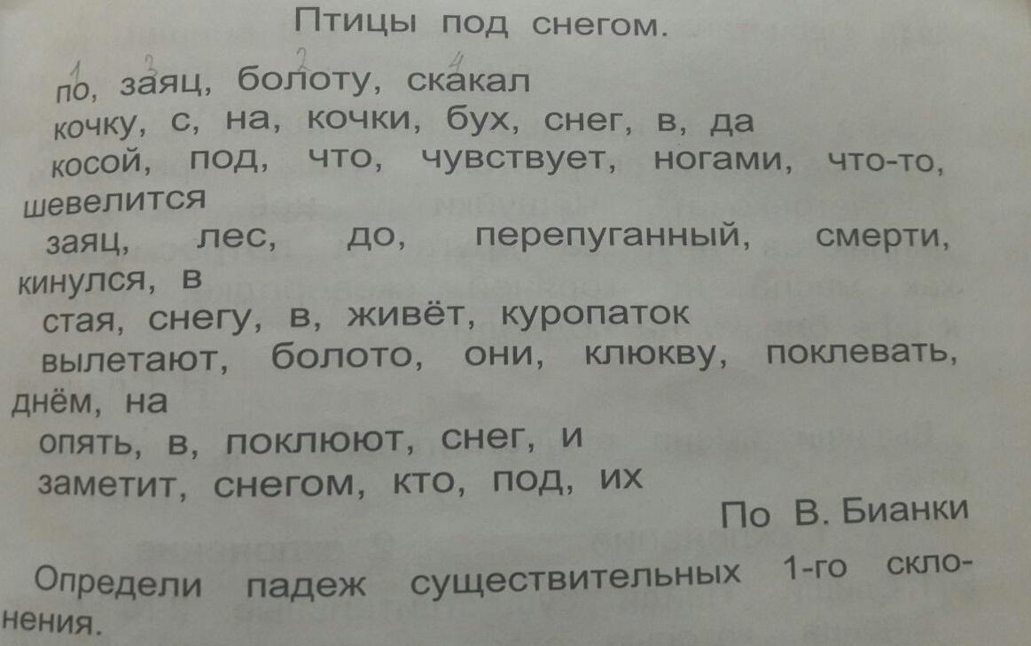 По болоту скакал заяц. С кочки (р.п.) на кочку (в.п.), да бух в снег. Чувствует косой, что под ногами (т.п., мн.ч.) что-то шевелится. Перепуганный до смерти заяц кинулся в лес. В снегу живёт стая (и.п.) куропаток (р.п., мн.ч.). Днём они вылетают на болота поклевать клюкву (в.п.). Поклюют - и опять в снег. Кто их под снегом заметит.