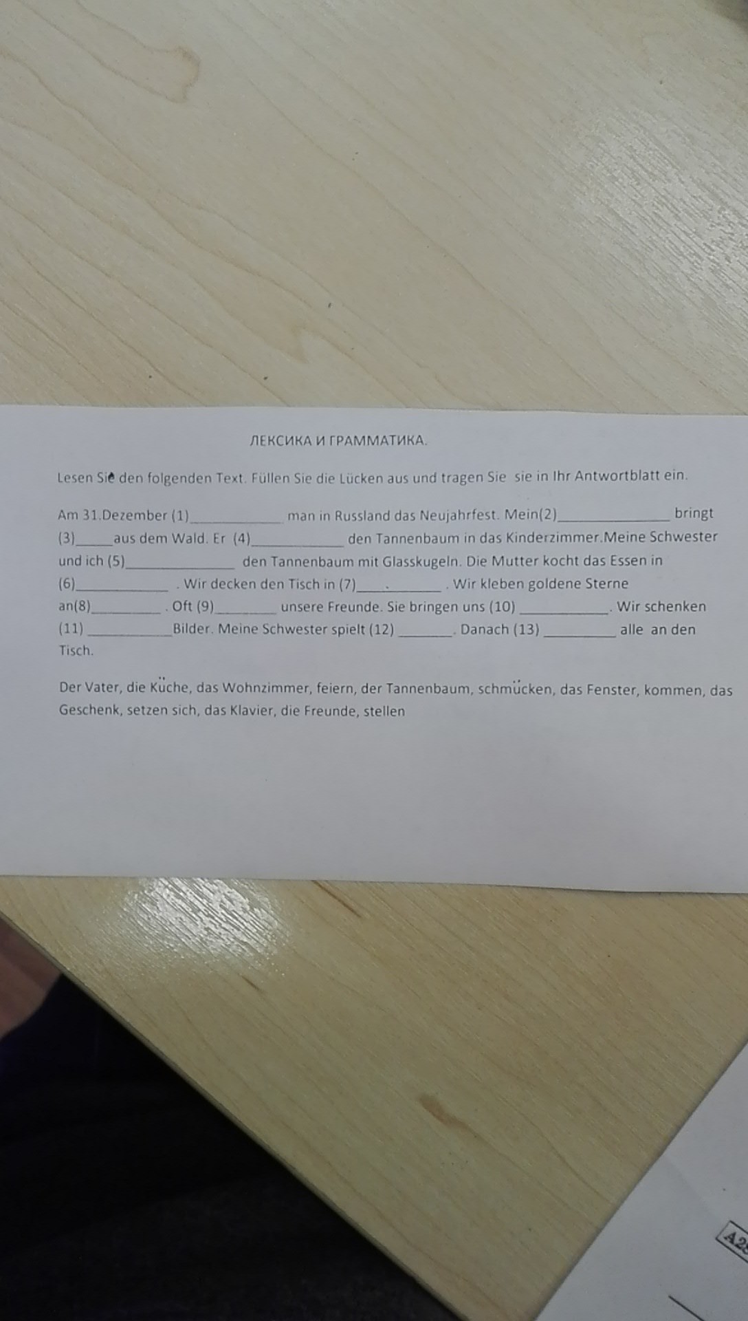 31 декабря в России отмечают Новый год. Мой папа принес елку из леса. Он поставил елку в детскую комнату. Моя сестра и я украшаем елку стеклянными шарами. Мама готовит еду на кухне. Мы накрываем стол в гостиной. Мы клеим золотые звезды на окно. Часто приходят наши друзья. Они приносят нам подарок. Мы дарим друзьям фотографии (рисунки, картины - можно любое значение). Моя сестра играет на пианино. Затем все садятся за стол.