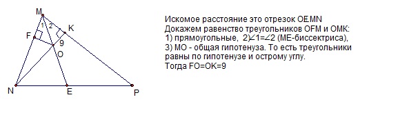 в остроугольном треугольнике MNP бесиктриса угла M пересикает высоту NK в точке О, причём ОК=9см .найдите растояние от точки О до прямой МN ПОМОГИТЕ РЕШИТЬ