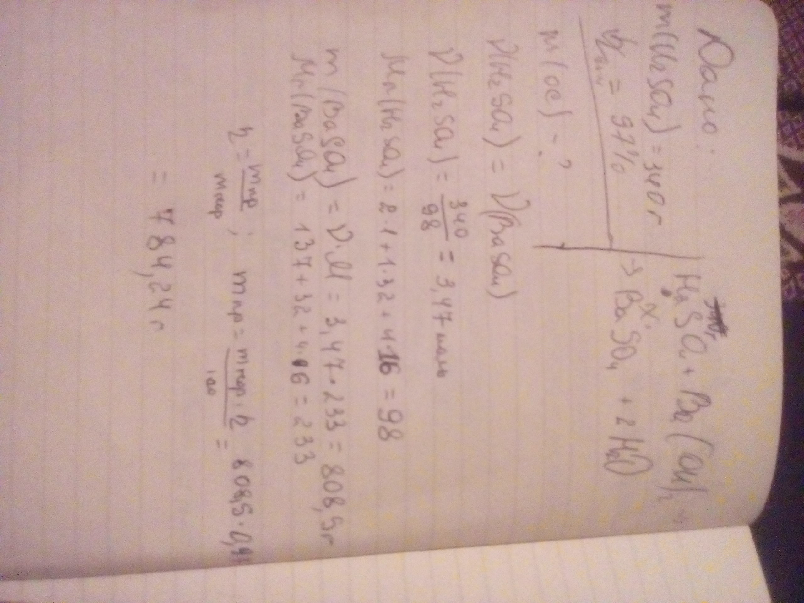 при взаимодействии гидроксида бария с раствором содержащим 340 г серной кислоты, образсовался осадок белого цвета, определите массу полученного осадка, если массовая доля выхода составляет 97%