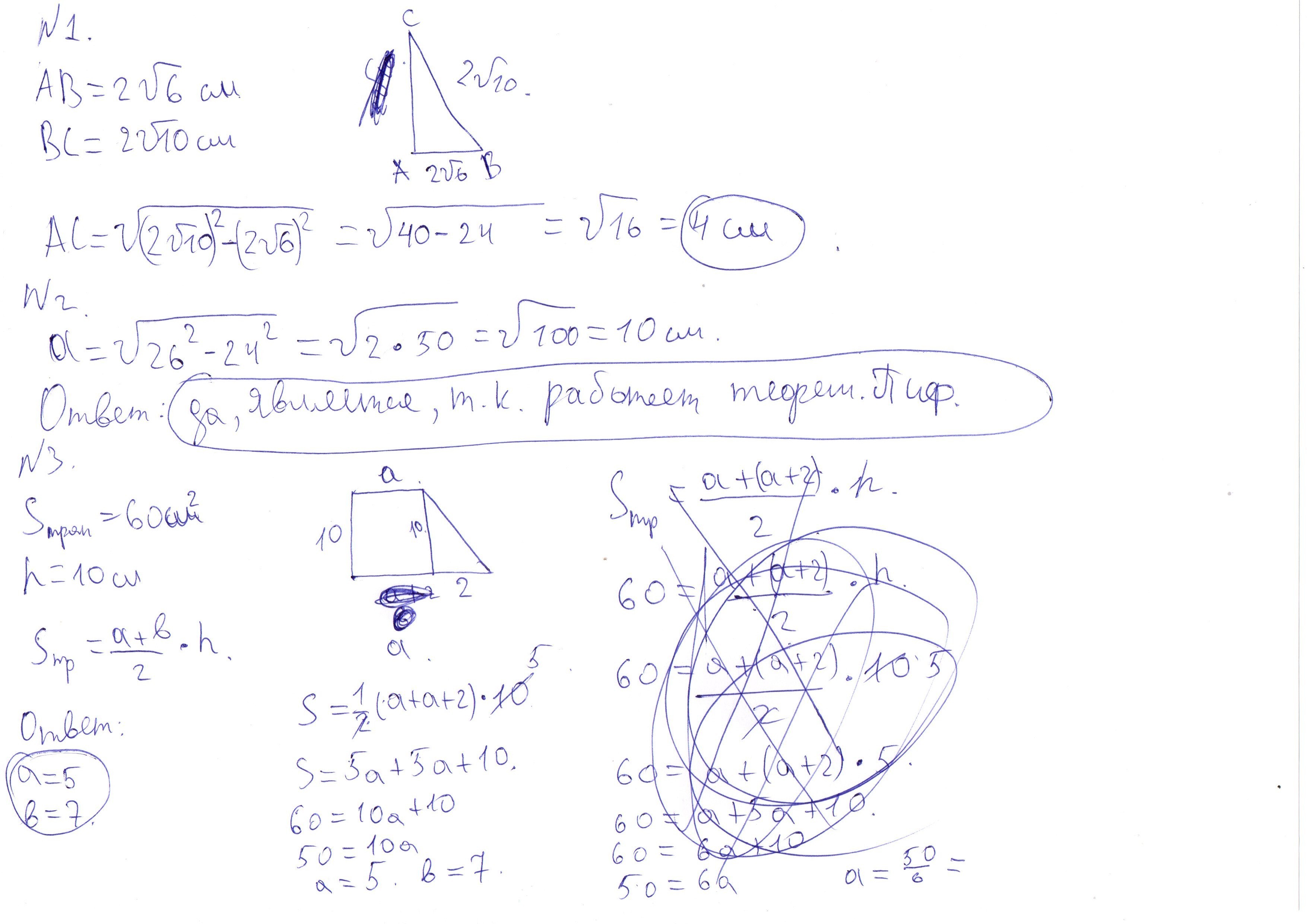 №3. Площадь прямоугольной трапеции равна 60 см2, а ее высота – 10 см. Найдите основания трапеции, если одно из оснований больше другого на 2 см.