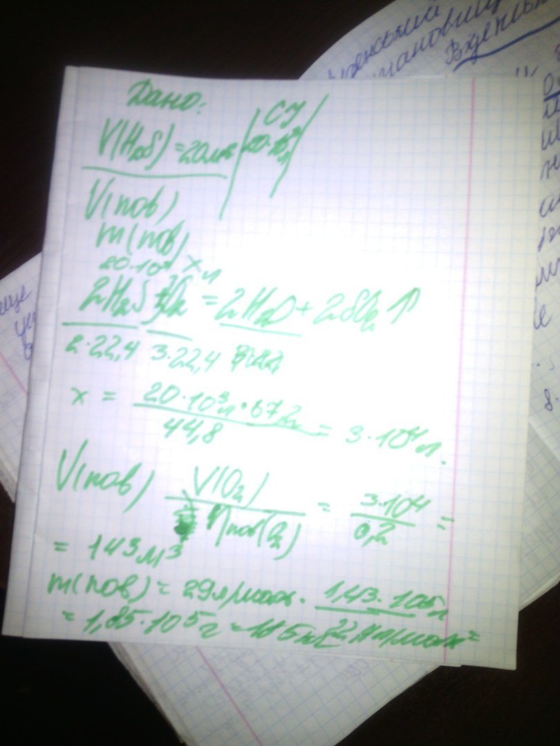 Вычислите объем воздуха (н.у.), который потребуется для сжигания 20м3 сероводорода, если при этом образуется вода и оксид серы (IV).вычислите массу и объем этого воздуха.