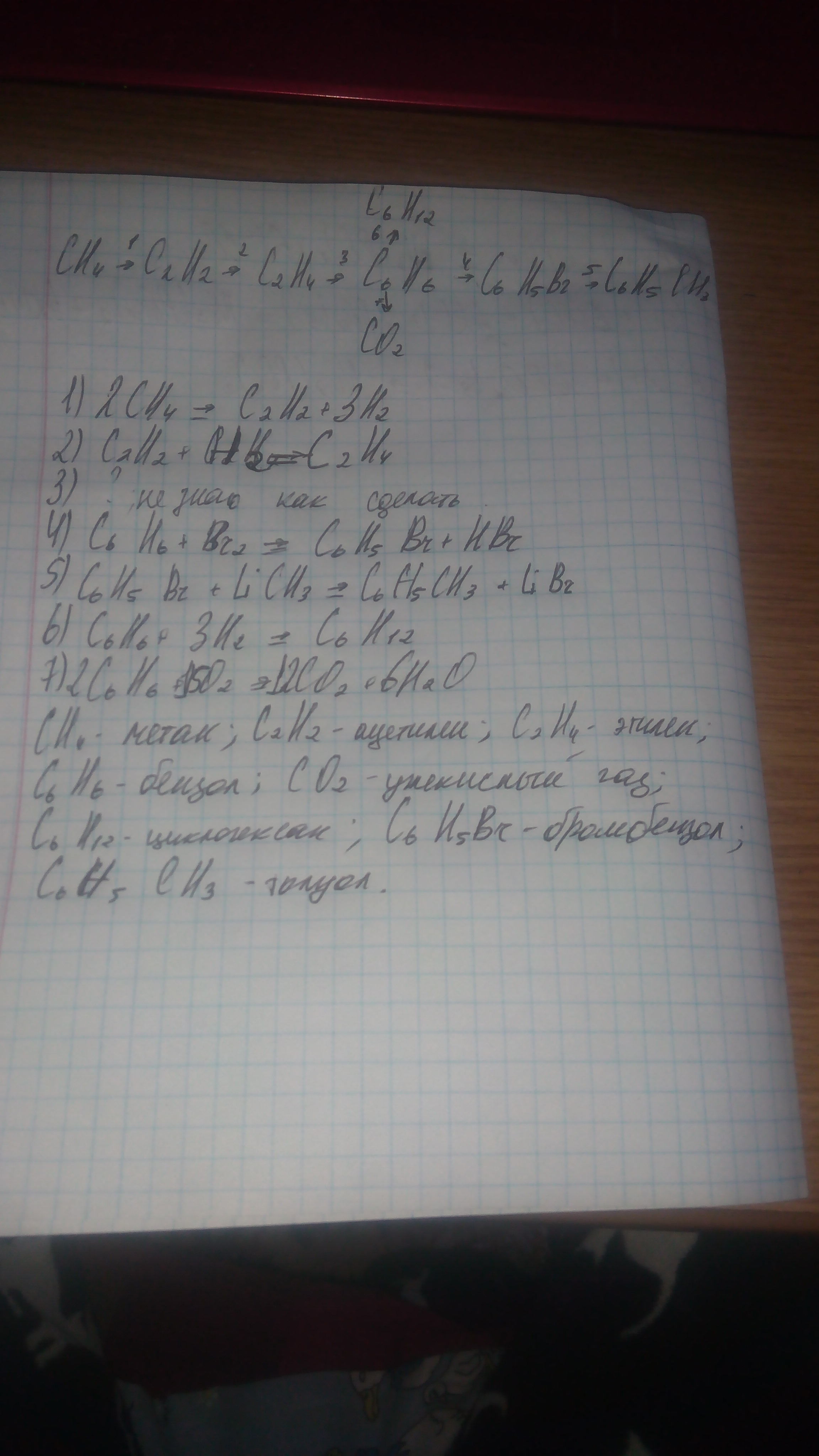 CH4→C2H2→C2H4→C6H6↑↓→C6H5Br→C6H5CH3