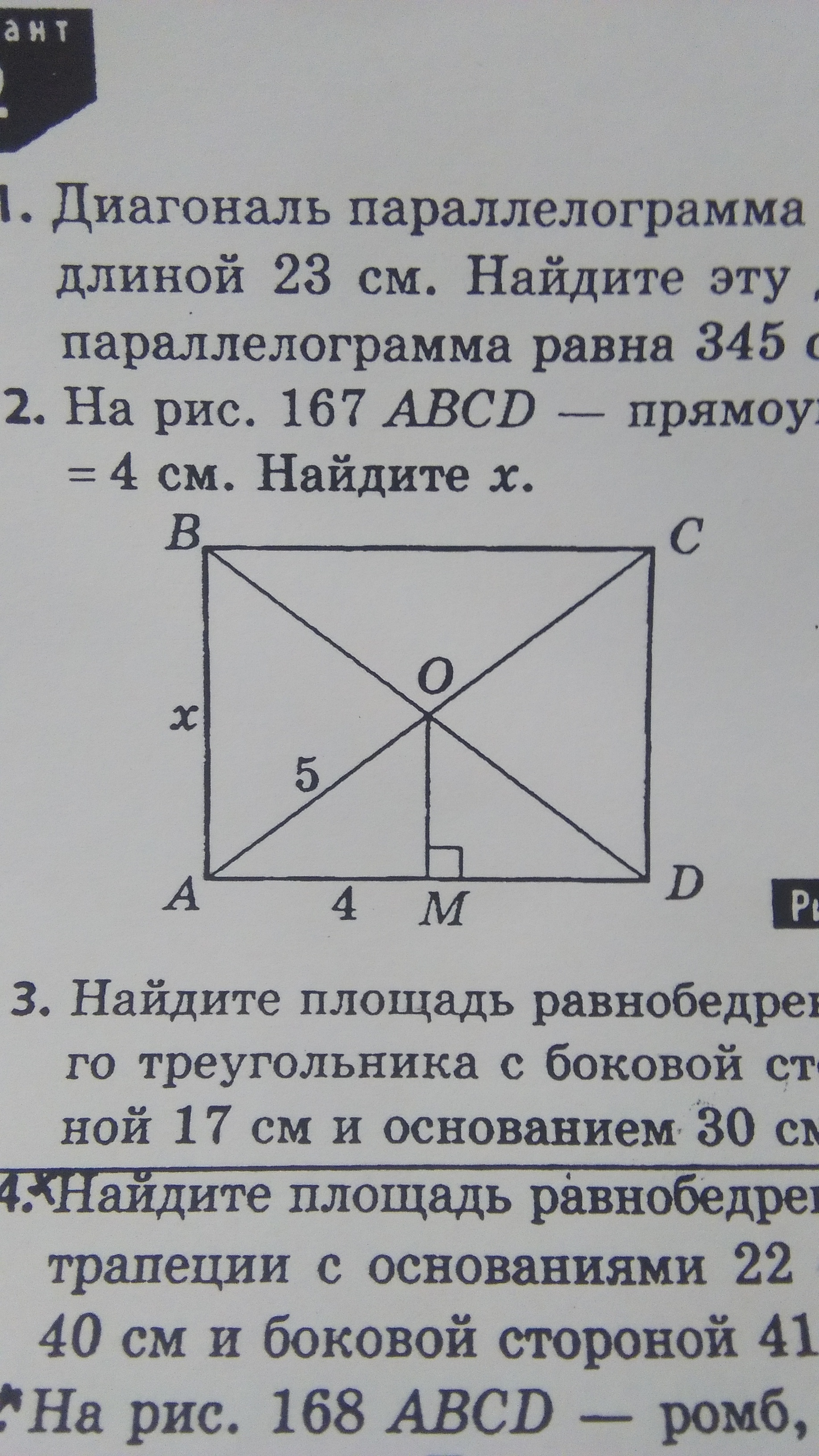 т.к. диагонали прямоугольника пересекаются по середине, то х= 2* ОМ