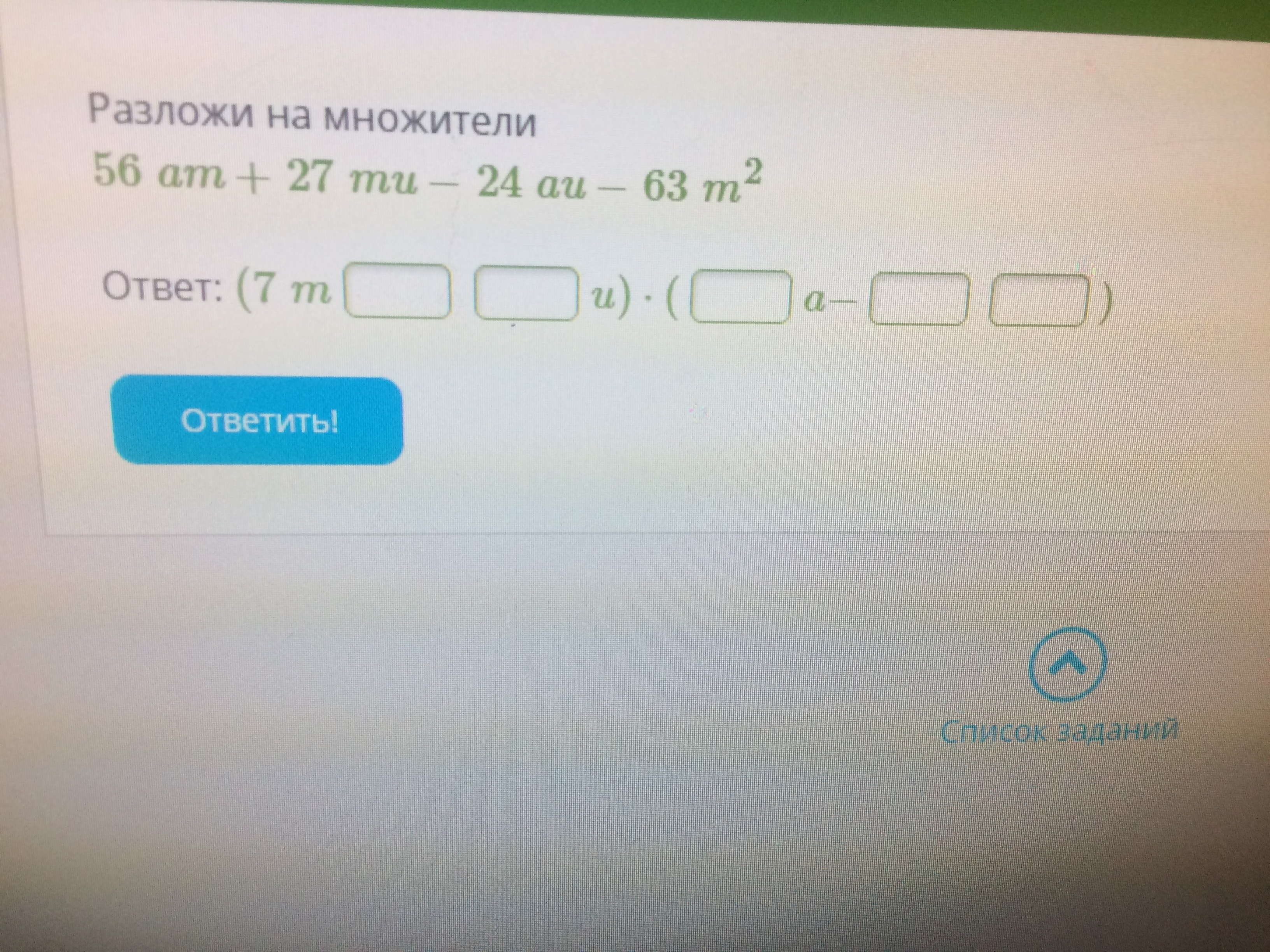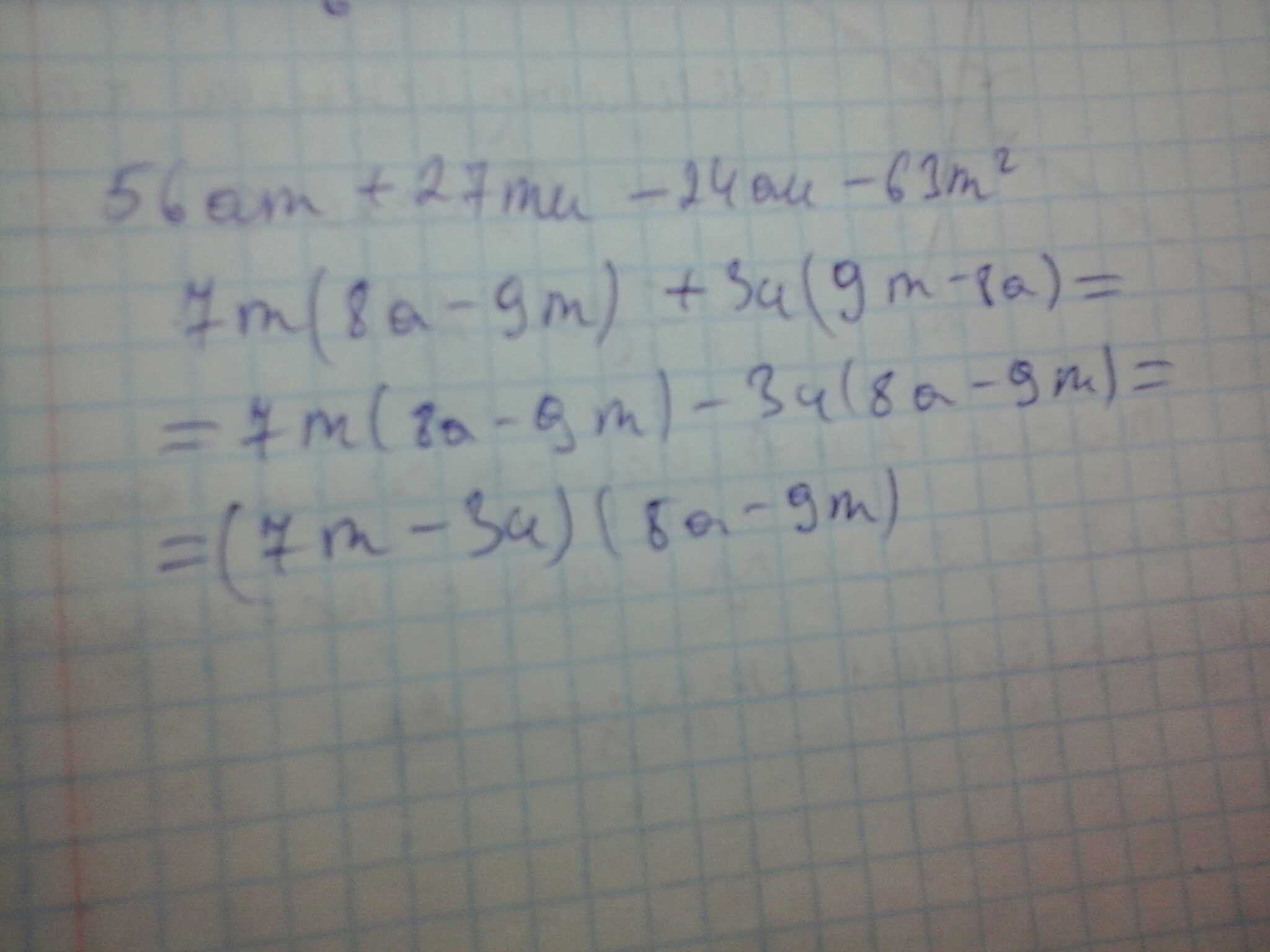 (56am-24au)-(63m²-27mu)=8a(7m-3u)-9m(7m-3u)=(7m-3u)(8a-9m)