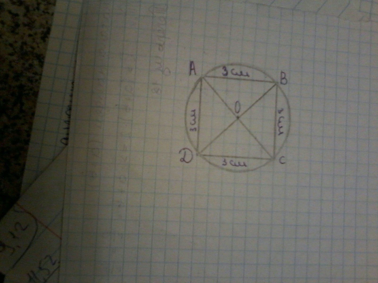 построй квадрат ABCD, длина стороны которого равна 3 см. Проведи в нём диагонали и обозначь буквой O точку их пересечения. начерти окружность с центром в точке O и радиусом OA.