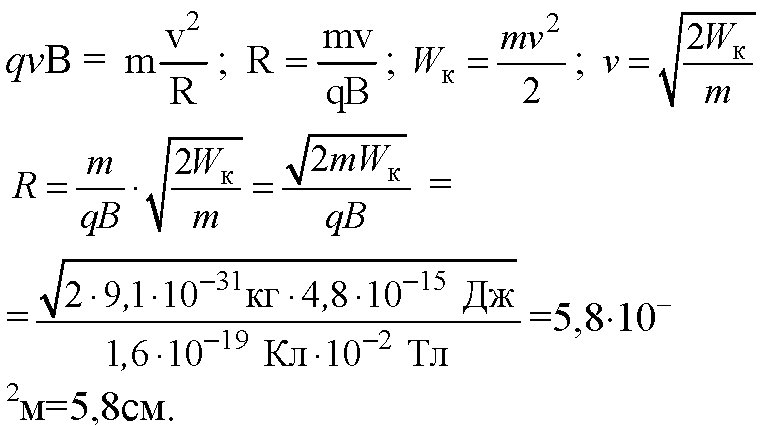 2) В однородном магнитное поле с индуктивностью 10 мТл перпендикулярно к линии магнитной индукции, влетает электрон с кинетической энергией 30 кэВ. Определите радиус окружности, по которой движется электрон в магнитном поле.