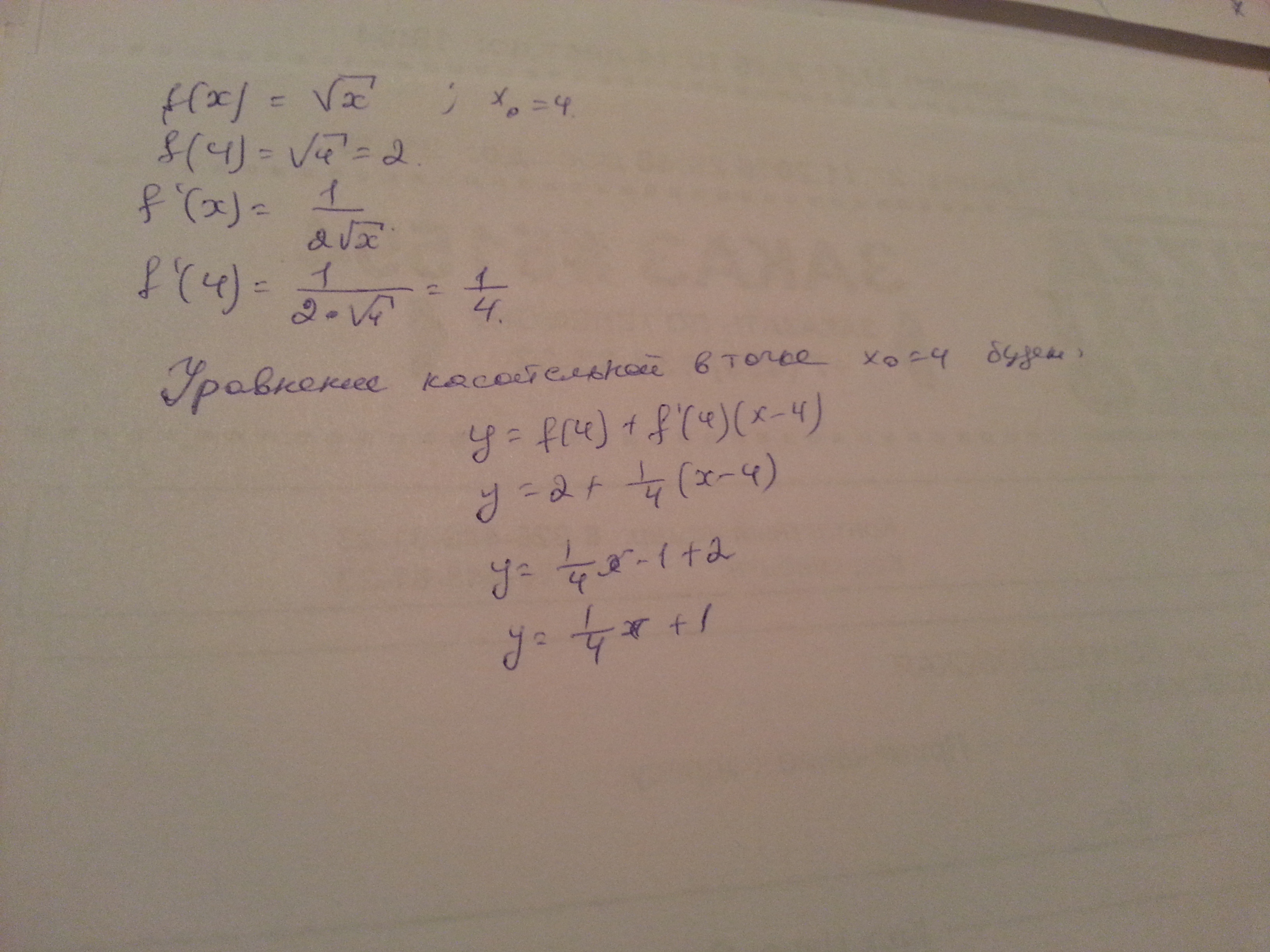 y=2+1/4(x-4)=2+1/4*x-1=1/4*x+1 уравнение касательной