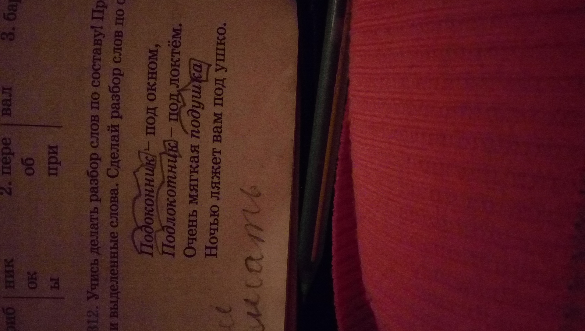 подоконник под приставка кон корень ник суффикс нулевое окончания, подушка под приставка уш корень к суффикс а окончание
