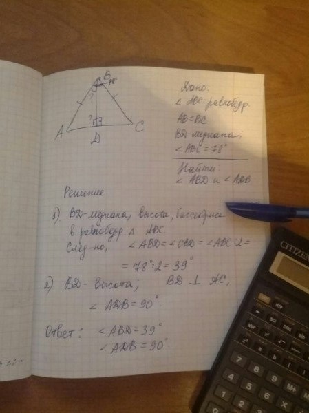 в равнобедренном треугольнике АВС с основанием АС проведена медиана BD. найдите углы ABD и ADB, если угол АВС = 78 градусов ребят, оформите, пожалуйста, как нужно ( дано, доказать (найти), доказательство(решение))