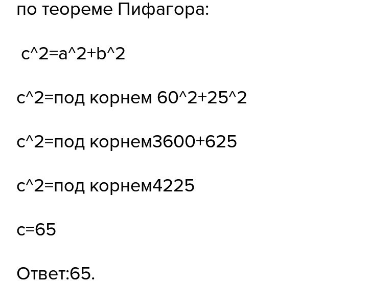 Гипотенуза равна 625 + 3600 = квадратный корень из 4225 = 65 см.