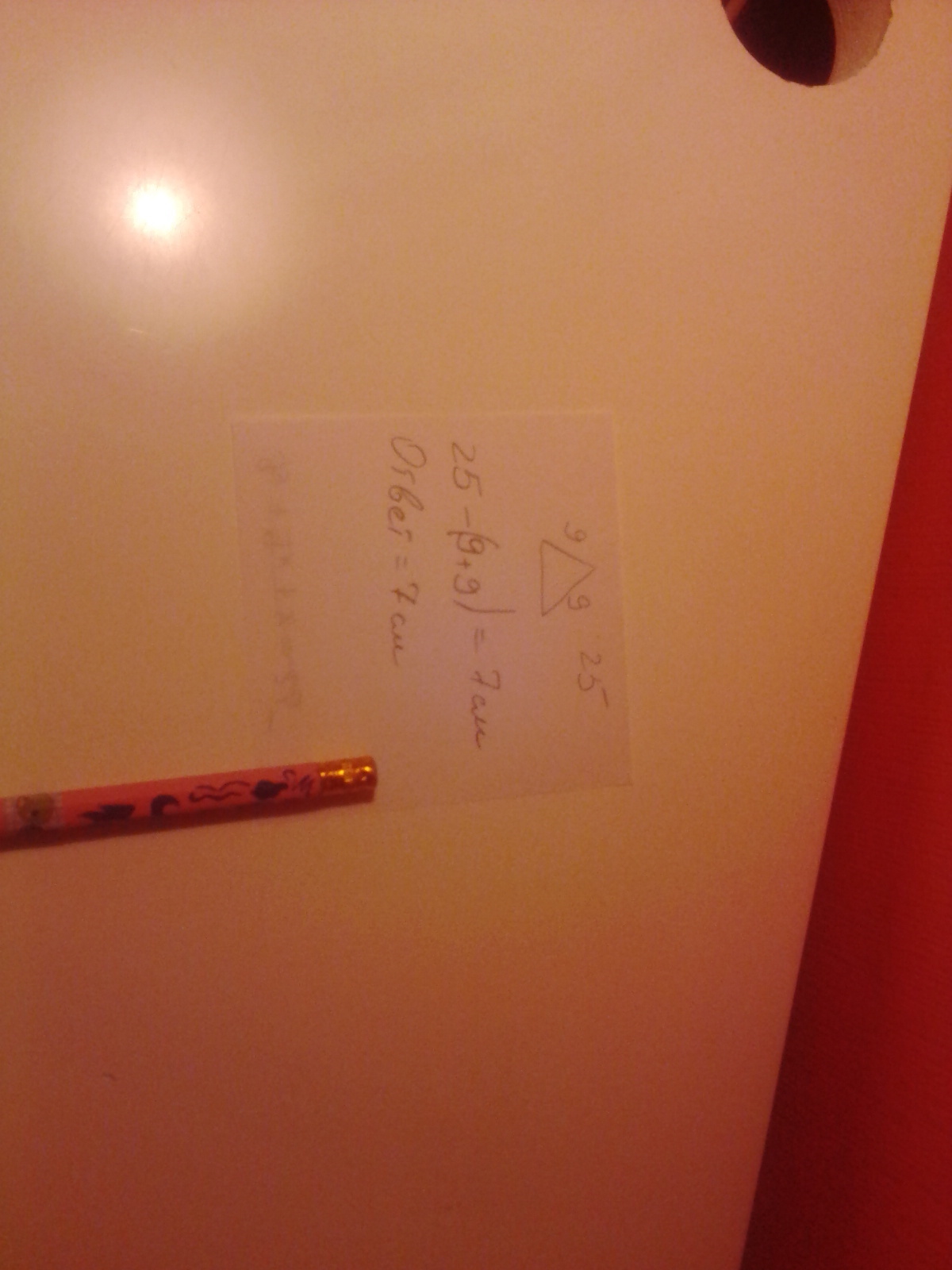 Т.к. одна боковая сторона равна 9, то и вторая будет равна 9. Осталось найти основание. Нужно от периметра отнять сумма двух боковых сторон: 25-(9+9)=25-18=7 (см)