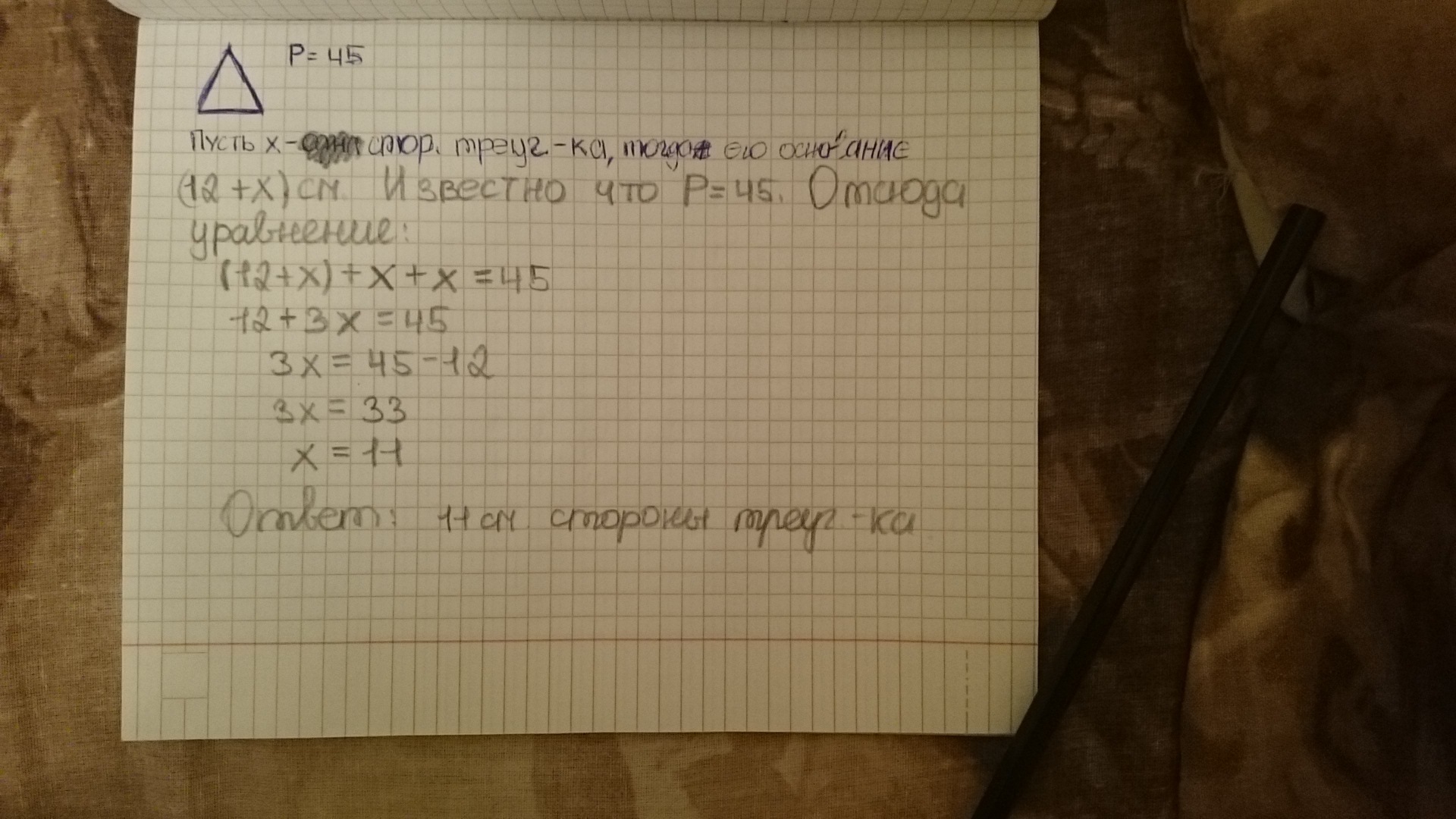 Периметр равнобедренного треугольника равен 45 см, а его основание больше боковой стороны на 12 см. Найдите стороны треугольника.