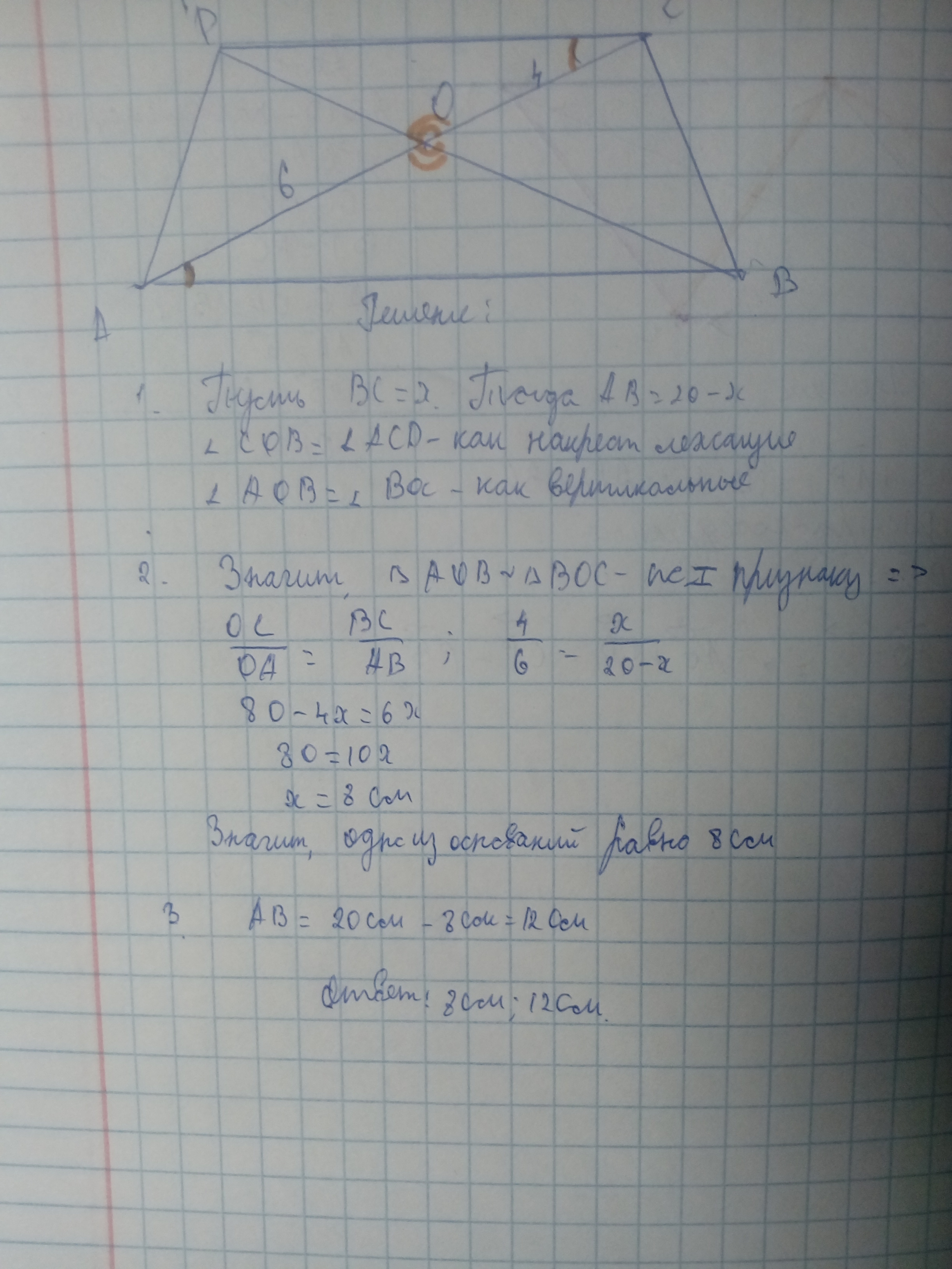 О- точка перетину діагоналей трапеції ABCD (AB || CD), AO= 6см, ОС = 4см. Знайдіть основи трапеції, якщо їх сума= 20см