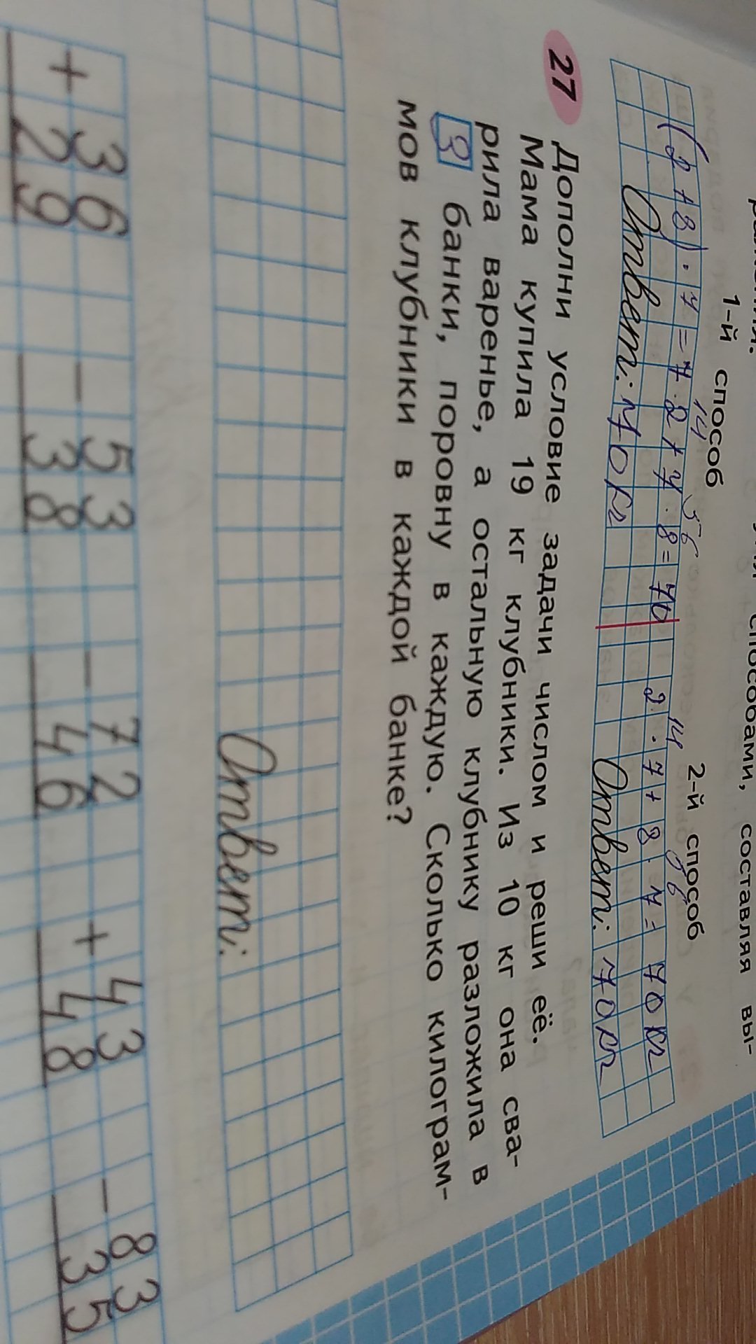 Мама купила 19 кг клубники.Из 10 кг она сварила варенье,а остальную клубнику разложила в 3 банки,поровну в каждую.