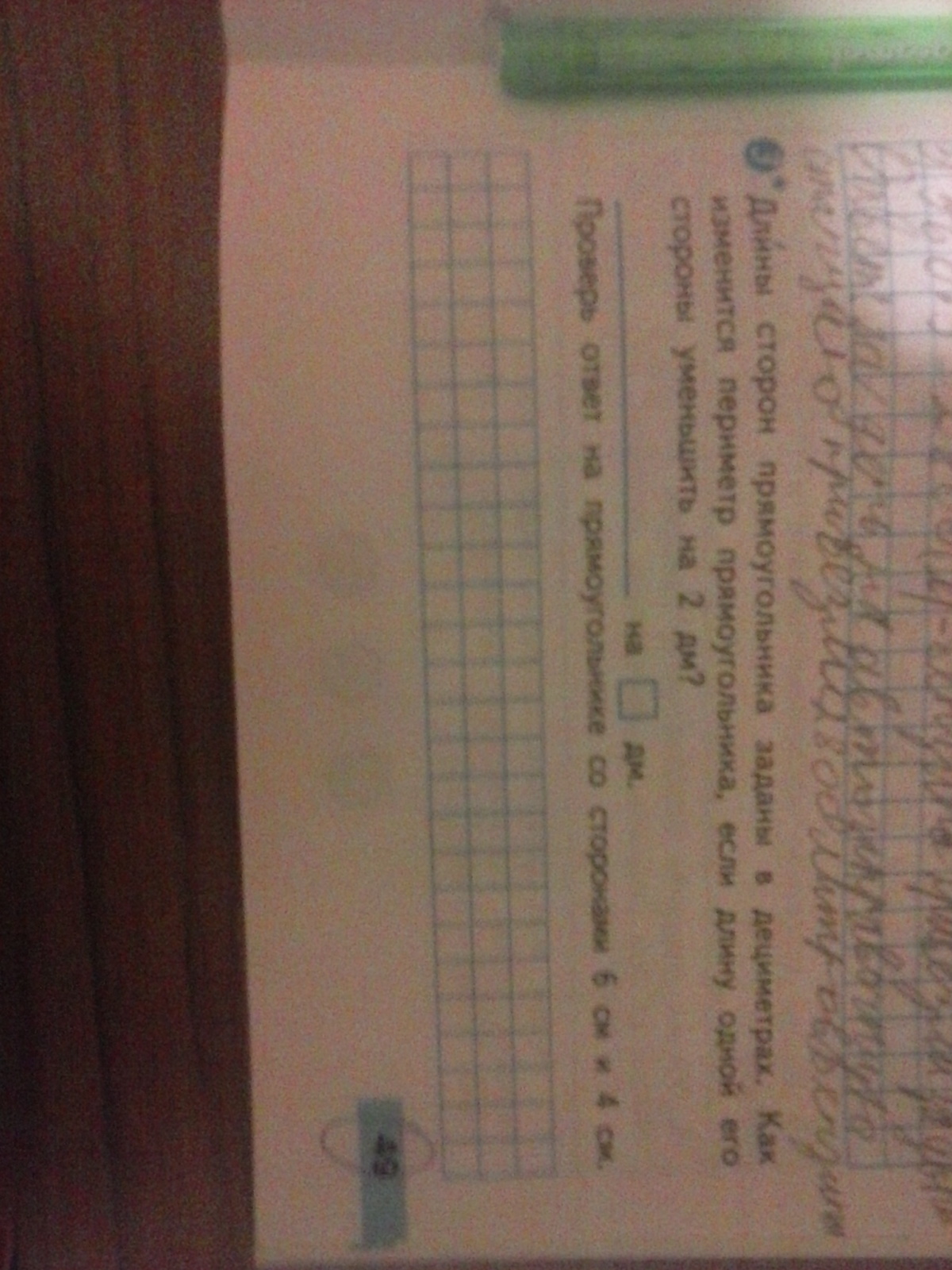 помогите Длины сторон прямоугольника заданы в дециметрах.Как изменяется периметр прямоугольника, если длину одной его стороны уменьшить на 2 дециметра?