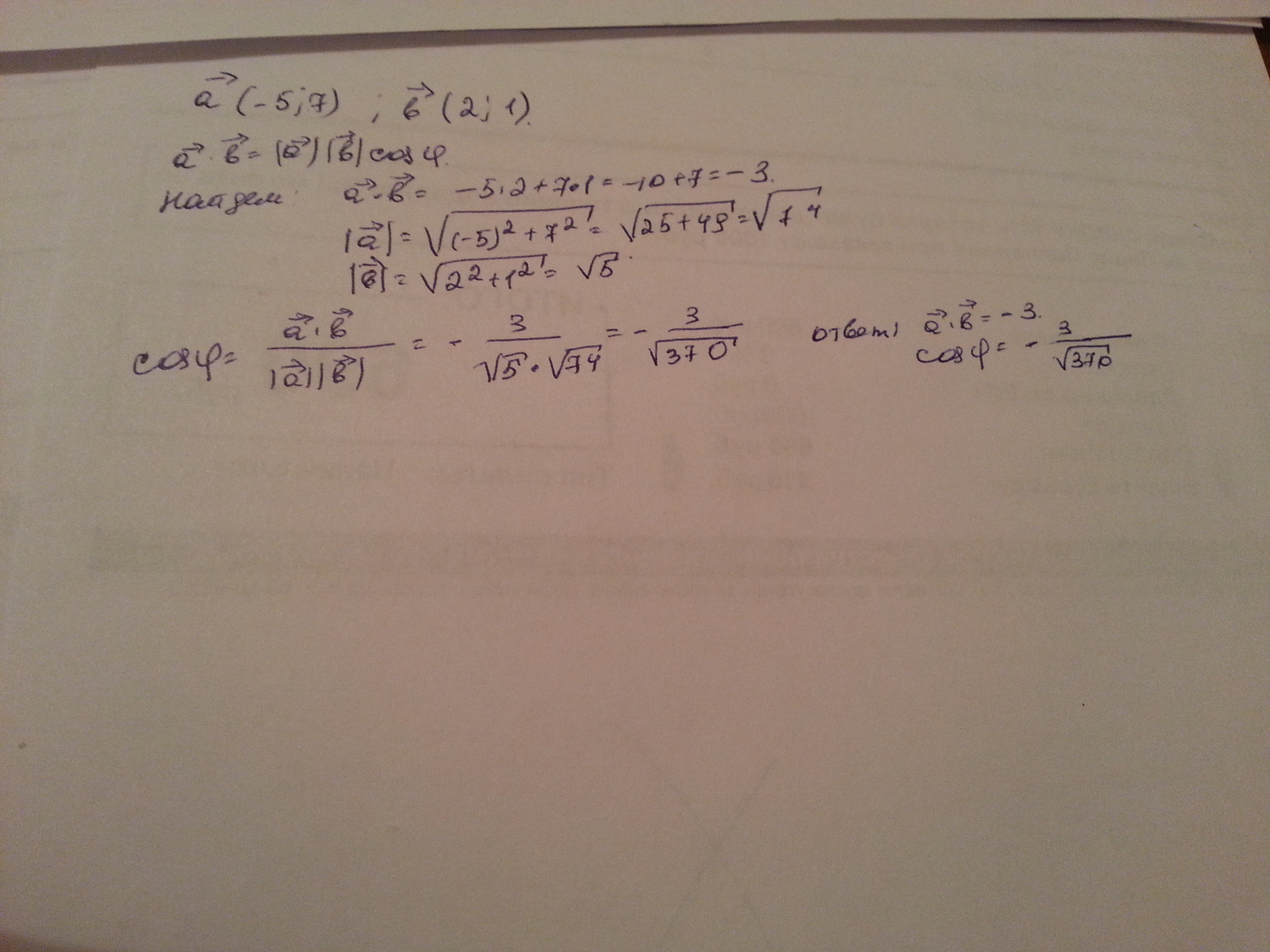 Решите пожалуйста вот этот пример. Найти сколярное произведение и угол между ними a {-5;7} b {2;1}