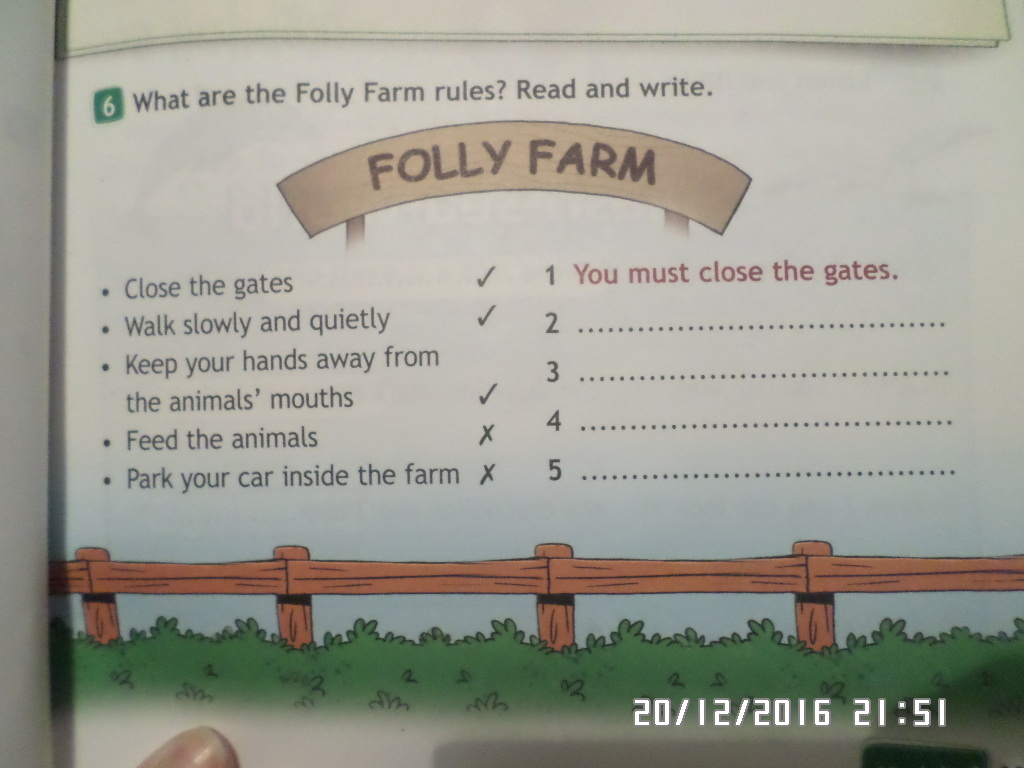 2. You must walk slowly and queietly. 3. You must keep your hands away from the animals` mouths. 4. You mustn`t feed the animals. 5. You mustn`t park your car inside the farm.