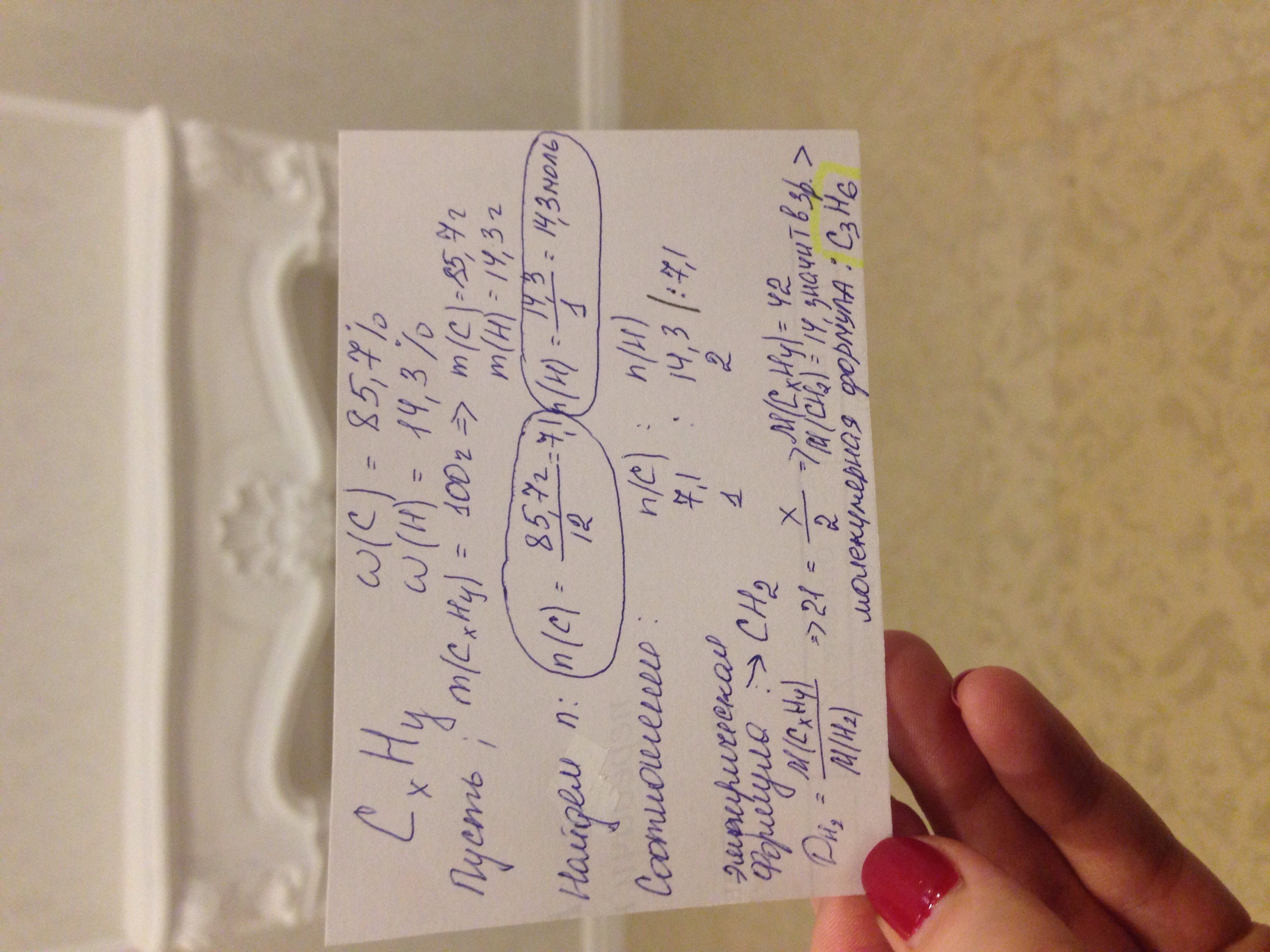 Выведите молекулярную формулу вещества , содержащего углерод (массовая доля 85,7%)и водорода(14,3%)плотность паров по водороду равна 21