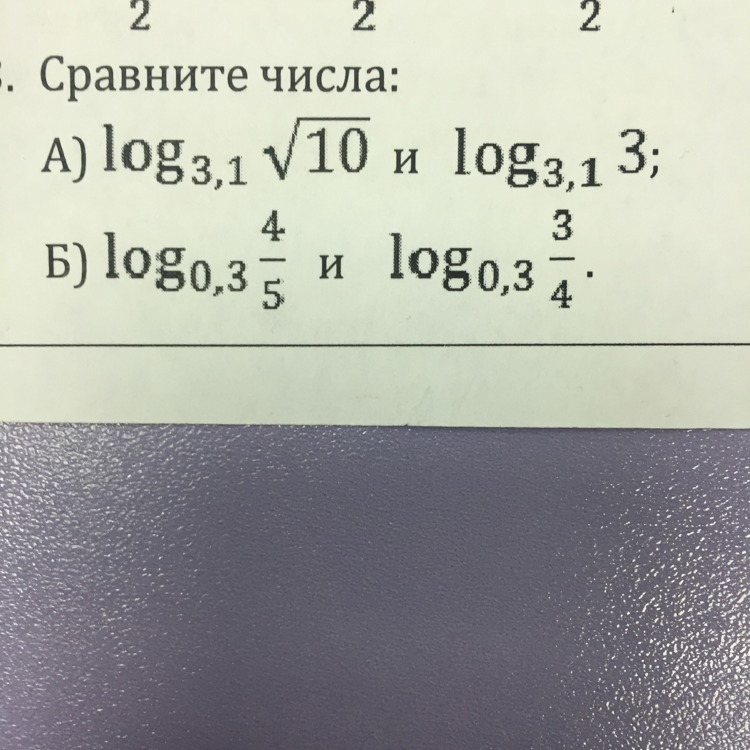 log_{3,1}, sqrt{10},  textgreater   log_{3,1}, 3; ,; tak; kak; ; 3,1 textgreater  1; ; i; ; sqrt{10} textgreater  3\\log_{0,3},  frac{4}{5}  textless  log_{0,3},  frac{3}{4}; ,; tak; kak; 0 textless  0,3 textless  1 ; ; i; ;  frac{4}{5}  textgreater  frac{3}{4}