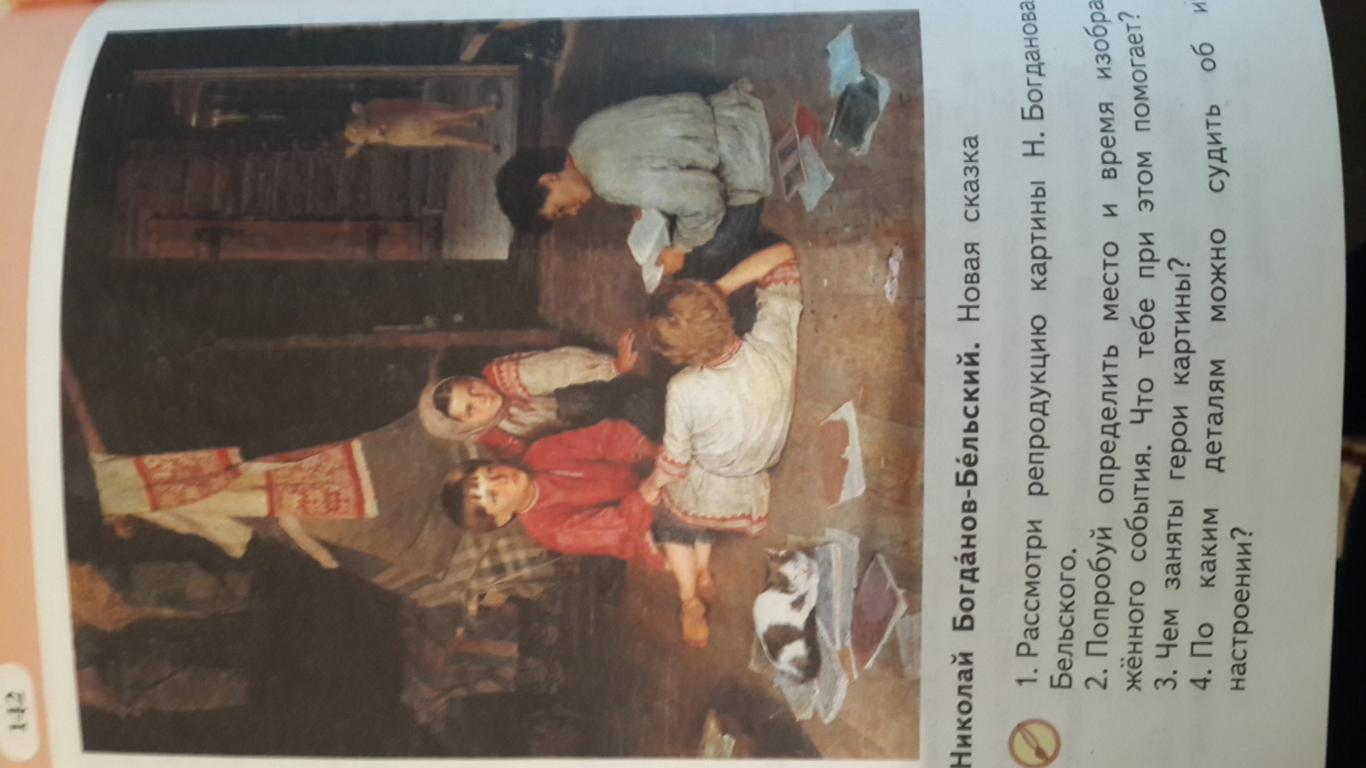 Картина называется Новая сказка,соответственно на ней показывается восхищение и восторг детей,читающих её впервые.Один мальчик даже лег,видимо сказка не коротка,остальные напряженно слушают,скорее всего в сказке самый напряжённый момент,кульминация.Они внимательно слушают,один из них читает.Действие происходит где-то дома.