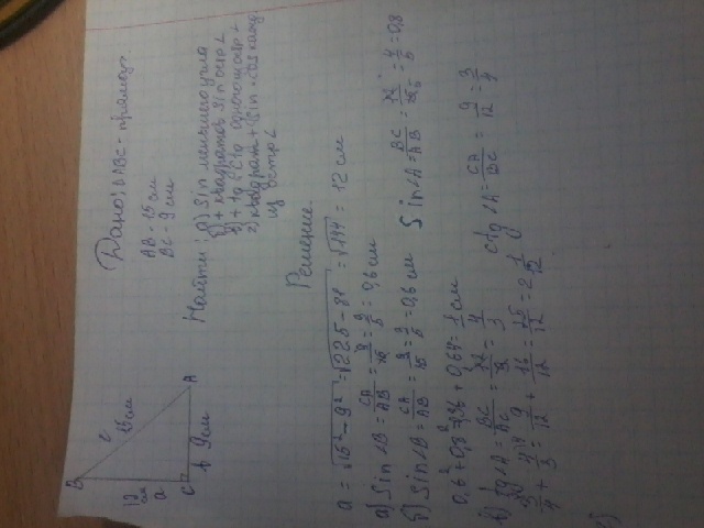 ГЕОМЕТРИЯ СРОЧНО!.В прямоугольном треугольнике гипотенуза равна 15 см а один из катетов 9 см.Найдите:а)синус меньшего острого угла треугольника;б)сумму квадратов синусов острых углов;в)сумму тангенса и котангенса одного из острых углов;г)квадрат суммы синуса и косинуса каждого из острых углов