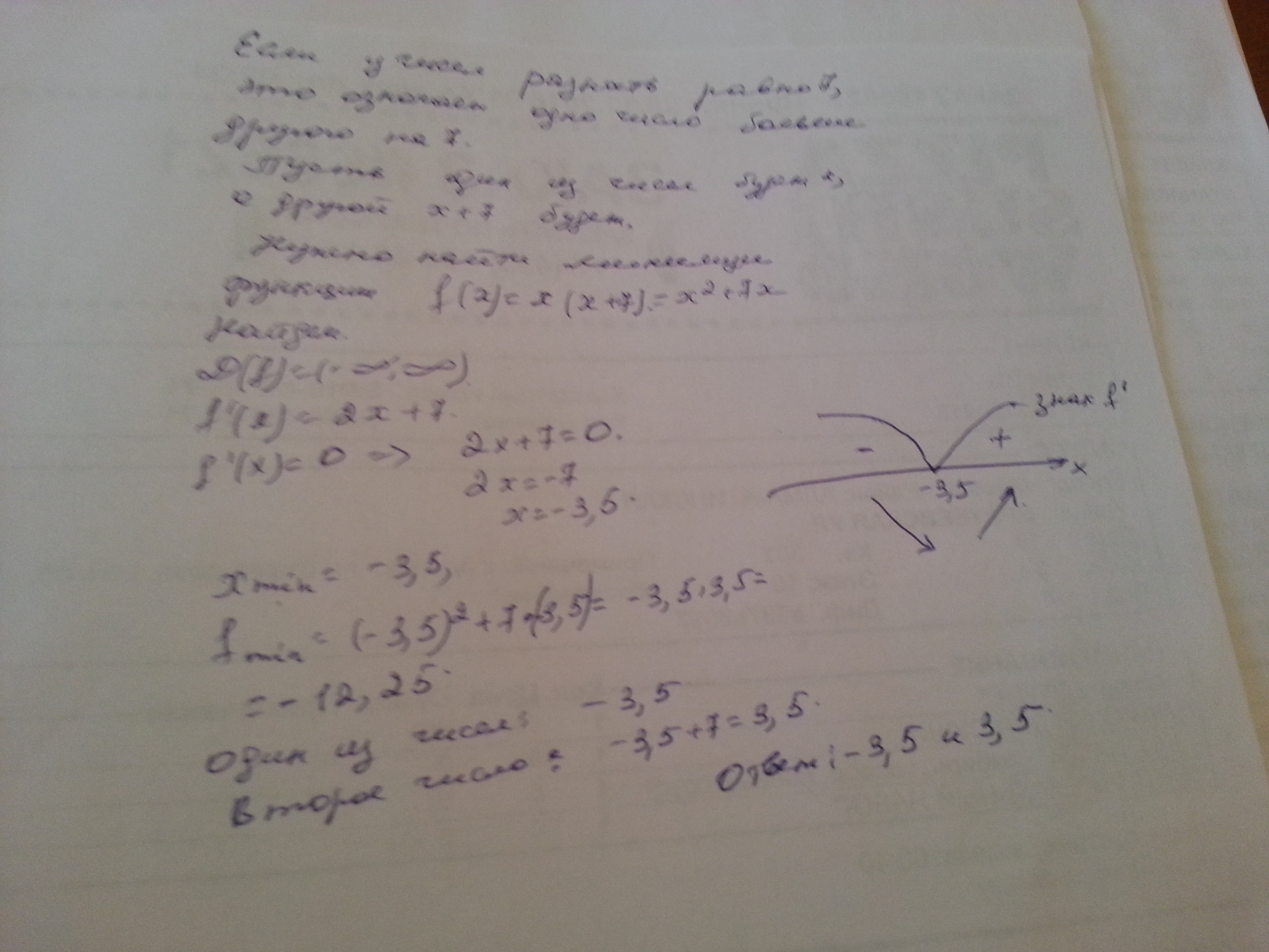 Разность двух чисел равна 7. Какими должны быть эти числа,чтобы произведение их было наименьшим.