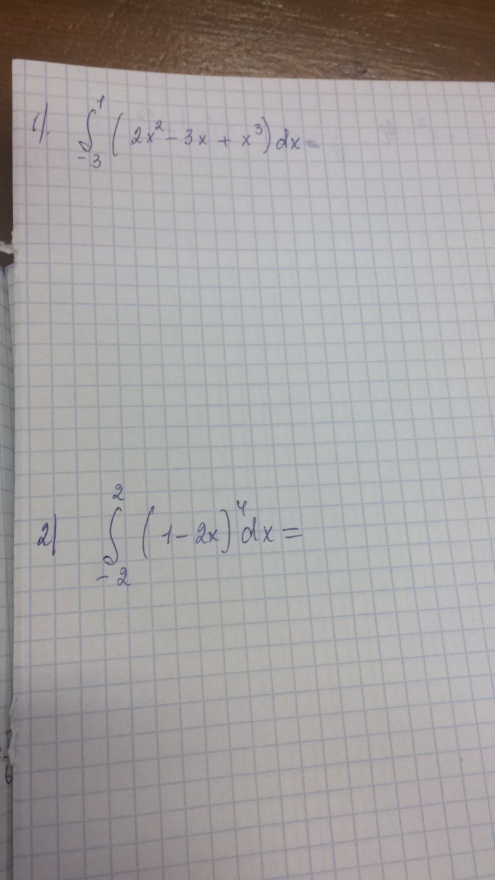 1)quad  intlimits_{-3}^1 {(2x^2-3x+x^3)} , dx =(2cdot  frac{x^3}{3}-3cdot frac{x^2}{2}+frac{x^4}{4} )_{-3}^1=\\=( frac{2}{3}-frac{3}{2}+frac{1}{4} )-( frac{2cdot (-27)}{3}-frac{3cdot 9}{2} +frac{81}{4})=\\= frac{56}{3} + frac{24}{2} -frac{80}{4}= frac{56}{3} +12-20= frac{32}{3}=10frac{2}{3}\\2)quad  intlimits^2_{-2} {(1-2x)^4} , dx    =-frac{1}{2}cdot frac{(1-2x)^5}{5}; |_{-2}^2=\\=-frac{1}{10}cdot ((1-4)^5-(1+4)^5)= -frac{1}{10}cdot (-243-3125)=-336,8