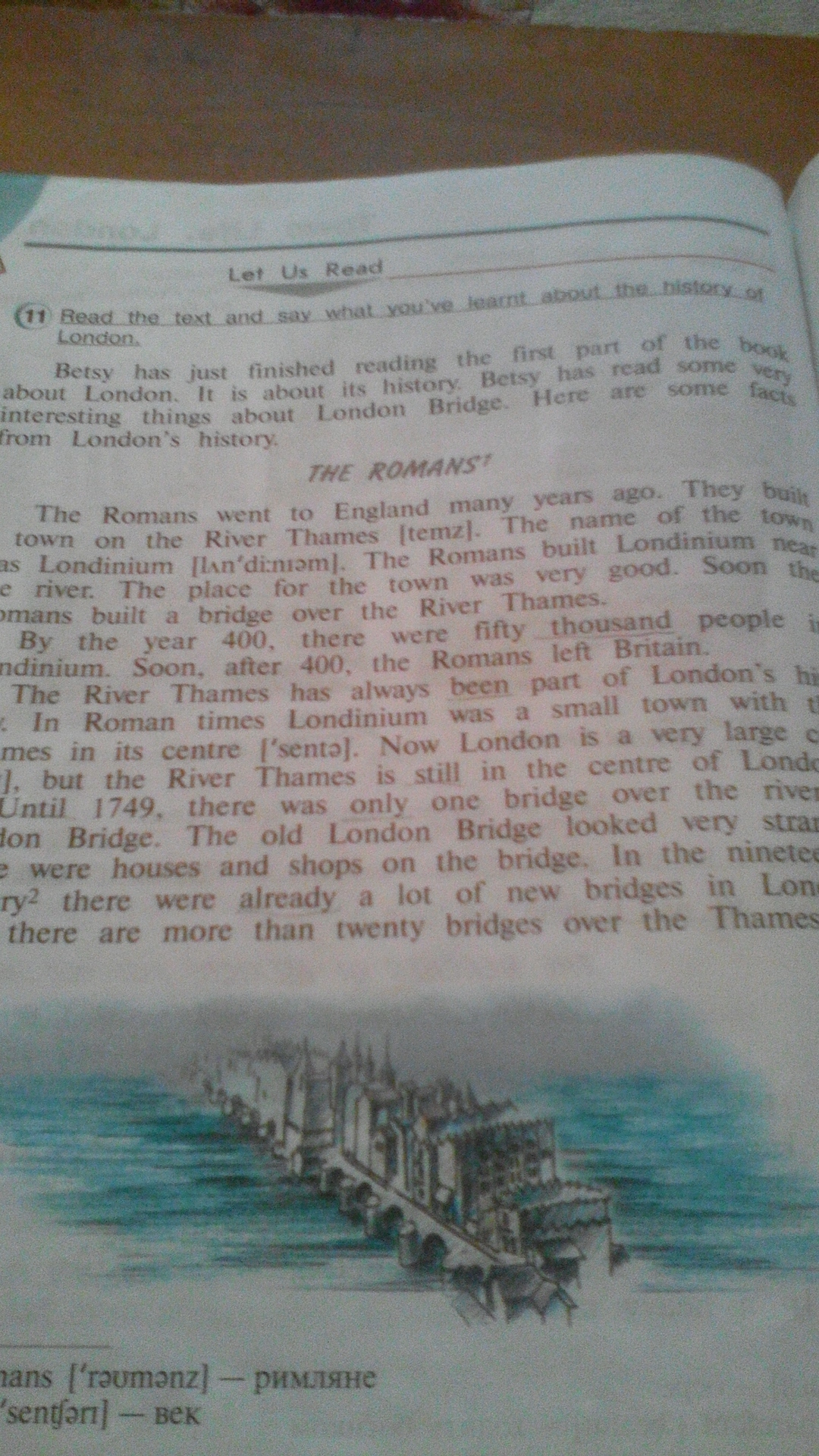 Римляне пошли в Англию много, много лет назад. Они построили город на реке Темзе. Название города было Londinium. Римляне построили Лондиниум около реки. Место для города было очень хорошо. Вскоре римляне построили мост через реку Темзу.