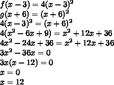 .Даны функции y=f(x) и y=g(x)=4x^2 ,а g(x)=x^2 При каких значениях аргументов выполняется равенство f(x-3)=g(x+6)?