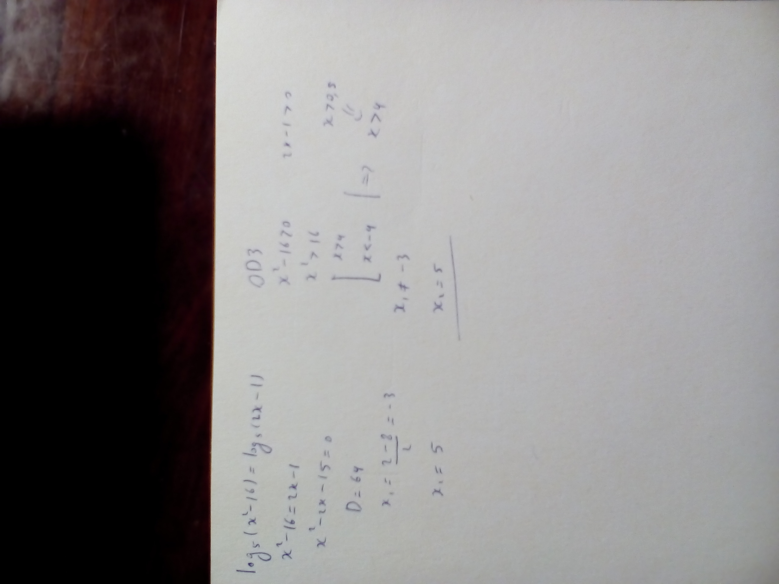 В первую очередь находим ОДЗ. x^2>16, где x>4 и x<-4 в левой части, x>0.5 из второго логарифма и получаем окончательно x>4. Здесь логарифмы с двух сторон с одинаковым основанием. Их можно убрать. Получается x^2-16=2x-1. x^2-2x-15=0. Решаем квадратное уравнение через дискриминант или теорему Виета и получаем корни x1=-3,x2=5. Смотрим на ОДЗ, остается одно решение x=5