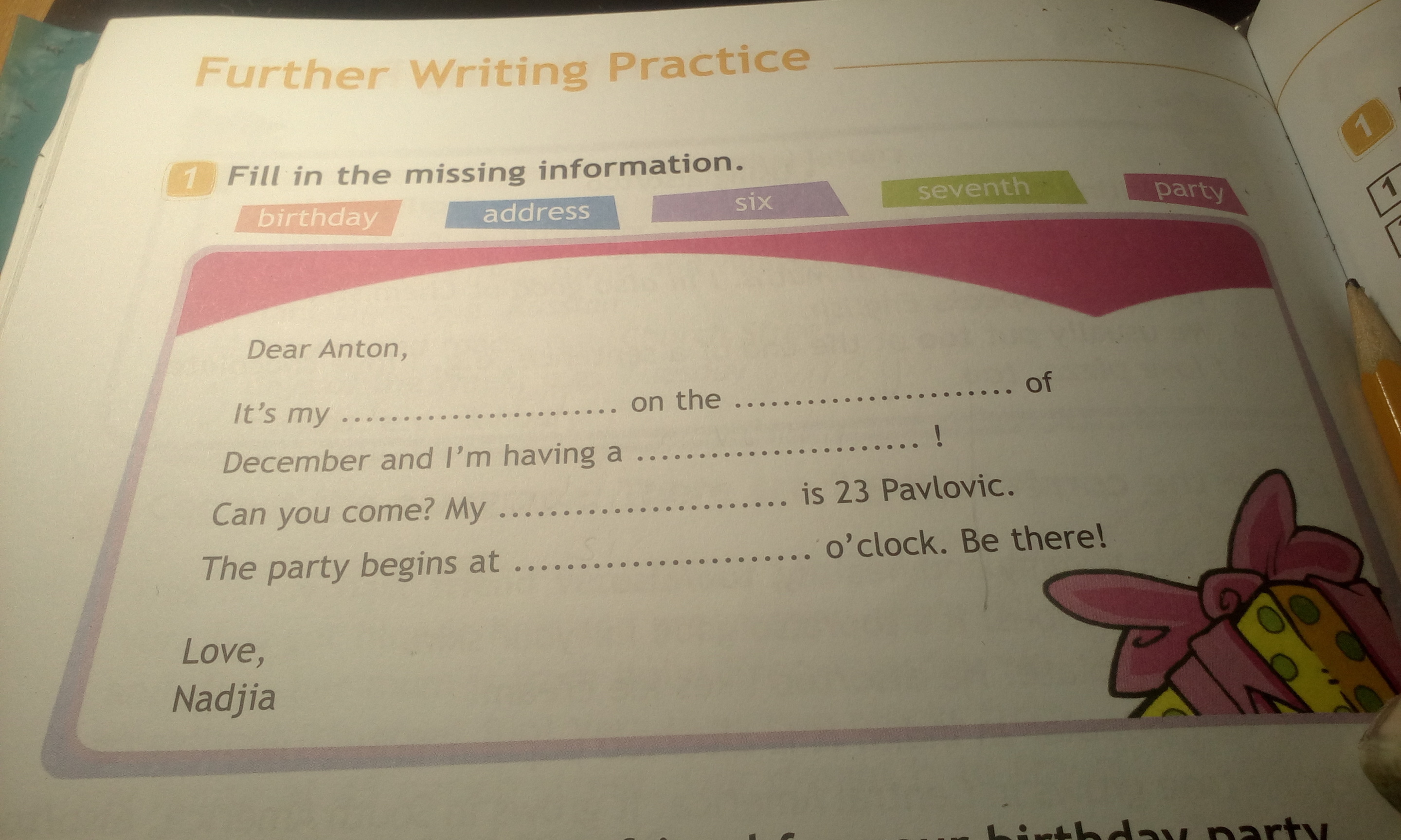 It's my birthday on the seventh December and I'm having a party! Can you come? my address 23 Pavlovic. The party at six o'clock.