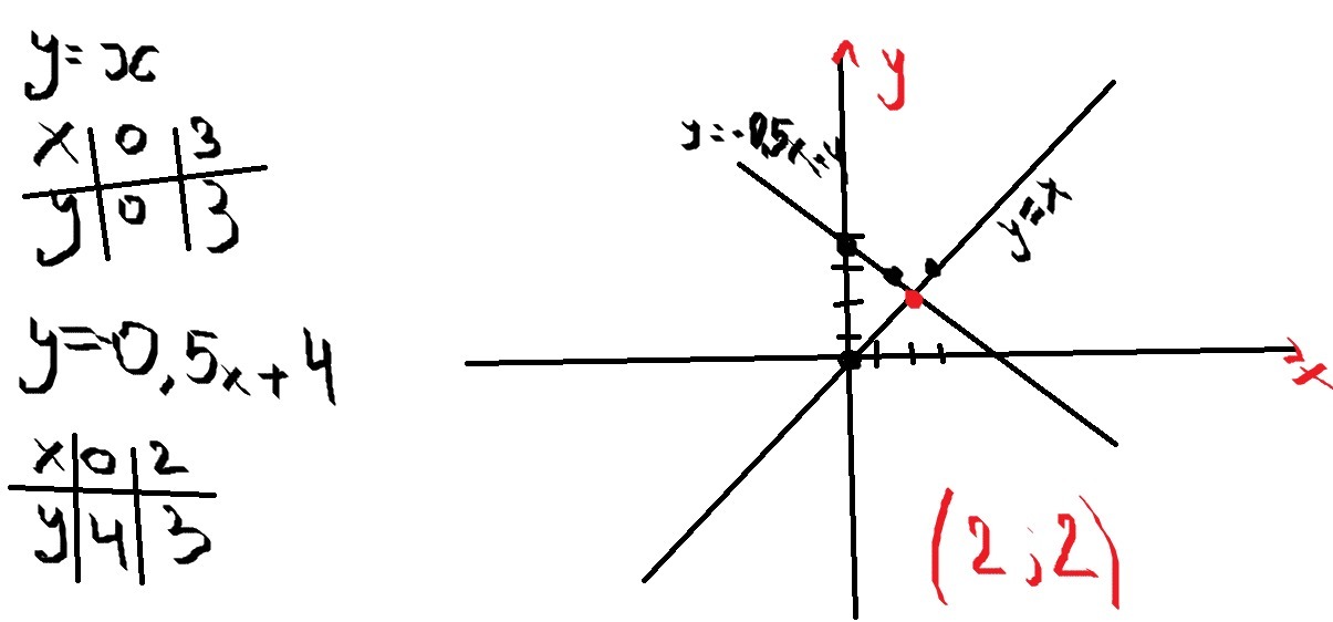 Срочно 20 баллов. Постройте графики функций и найдите координаты точки Пересечения: y=x и y=-0.5 x+4