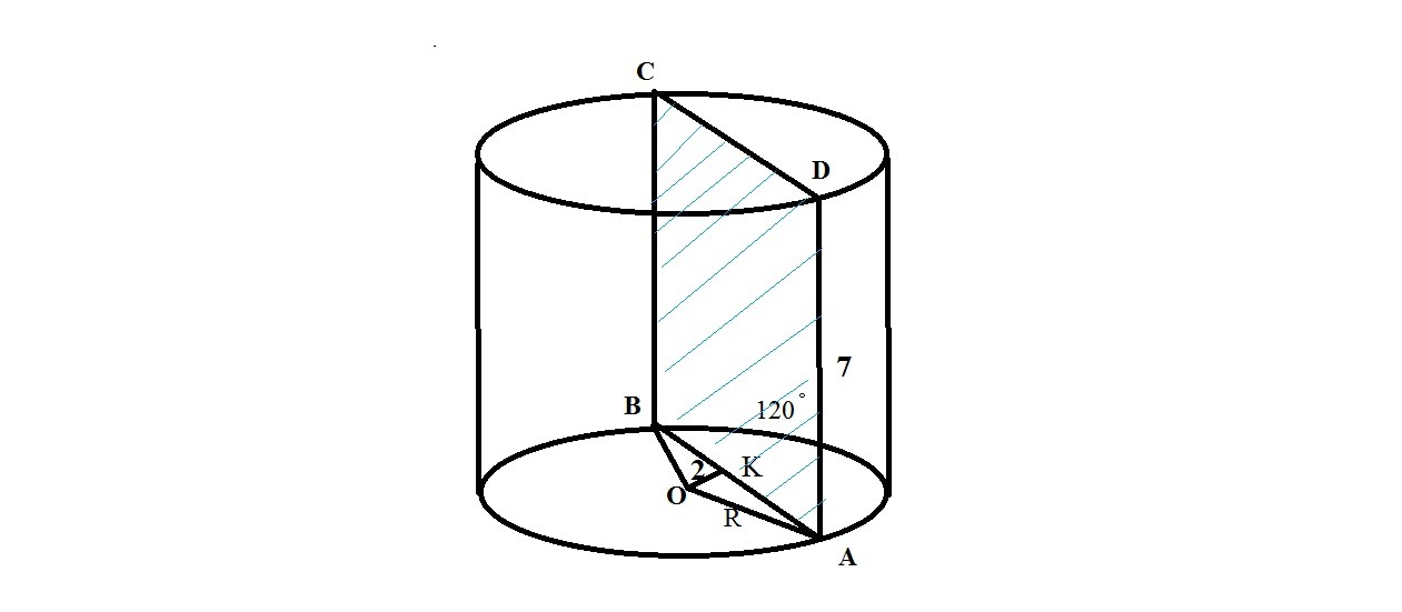 Сечение цилиндра плоскостью, параллельной оси, отсекает от окружности основания дугу в 120. Найдите площадь сечения, если высота цилиндра равна 7 см, а расстояние между осью цилиндра и секущей плоскостью равно 2 см. с подробным решением и рисунком.