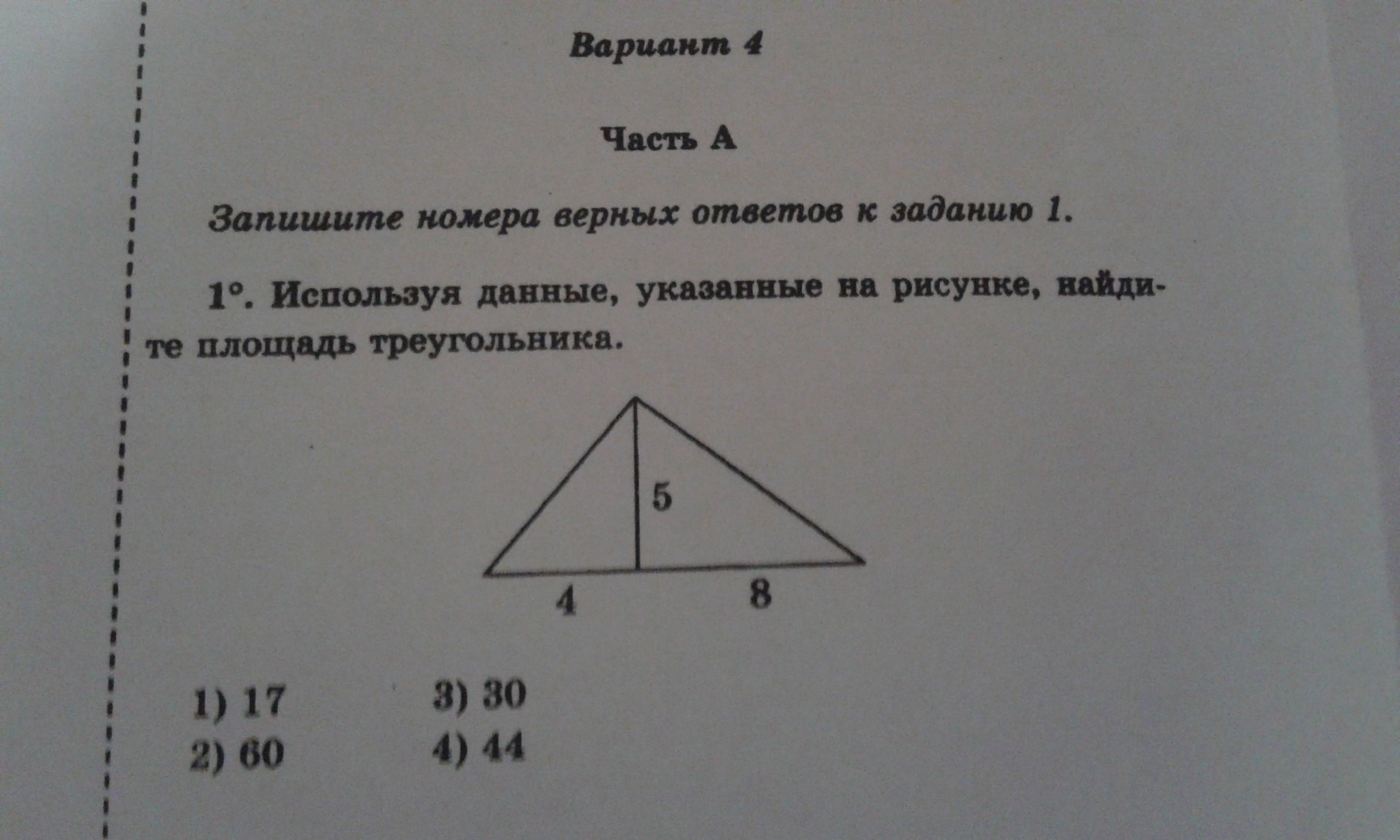пиши 4•5=20 20:2=10 и 5 •8 =40 40:2=20 ОТВЕТ ПЛОЩАДЬ РОВНА 30