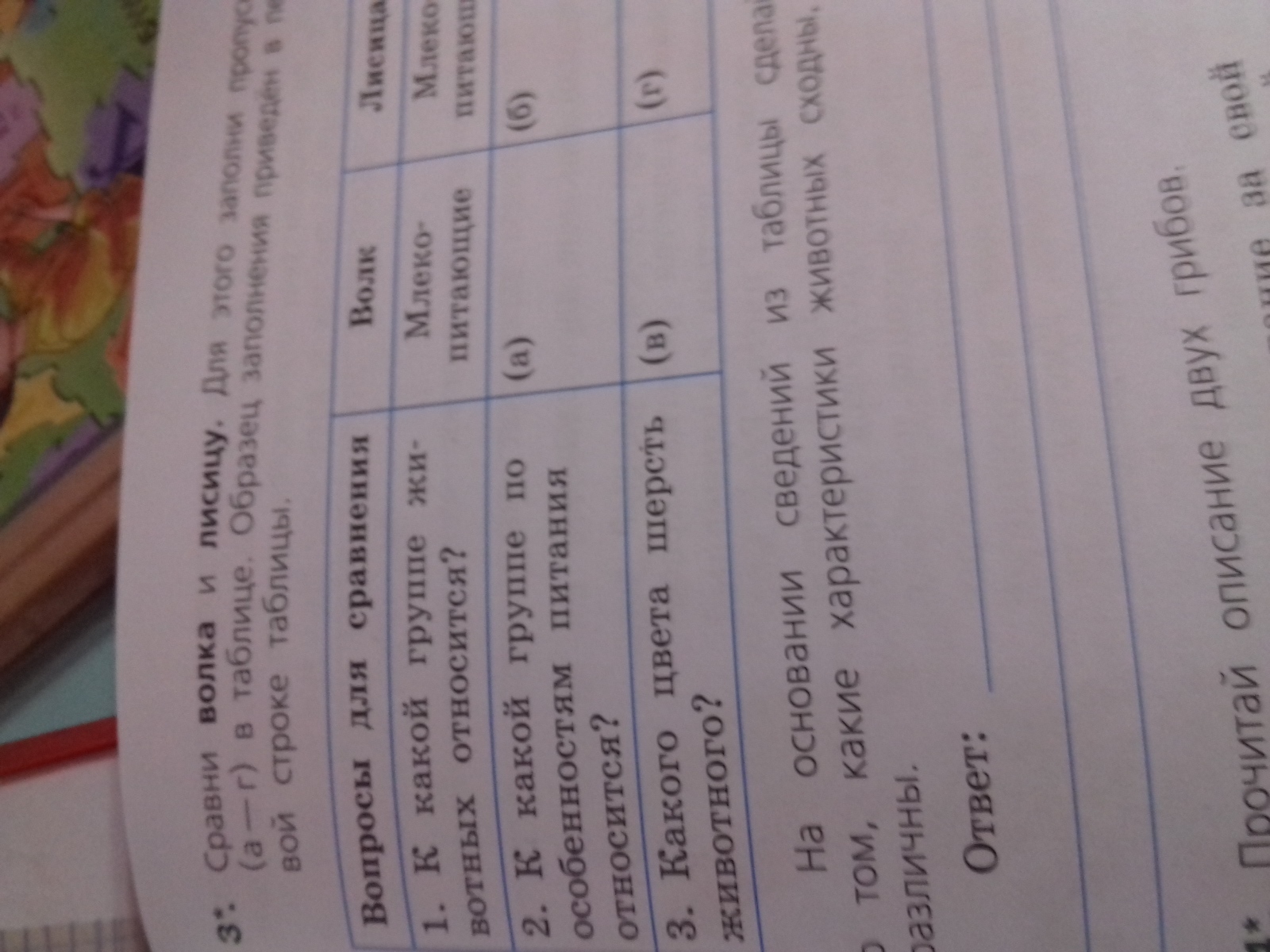 Сравни волка и лисицы. Для этого заполни пропуски (а-г) а таблице Образец заполнения приведён в первой строка таблицы.