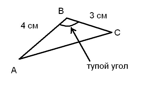 Треугольник АВС - искомый. АВ = 4 см., ВС = 3 см. Угол В - тупой.