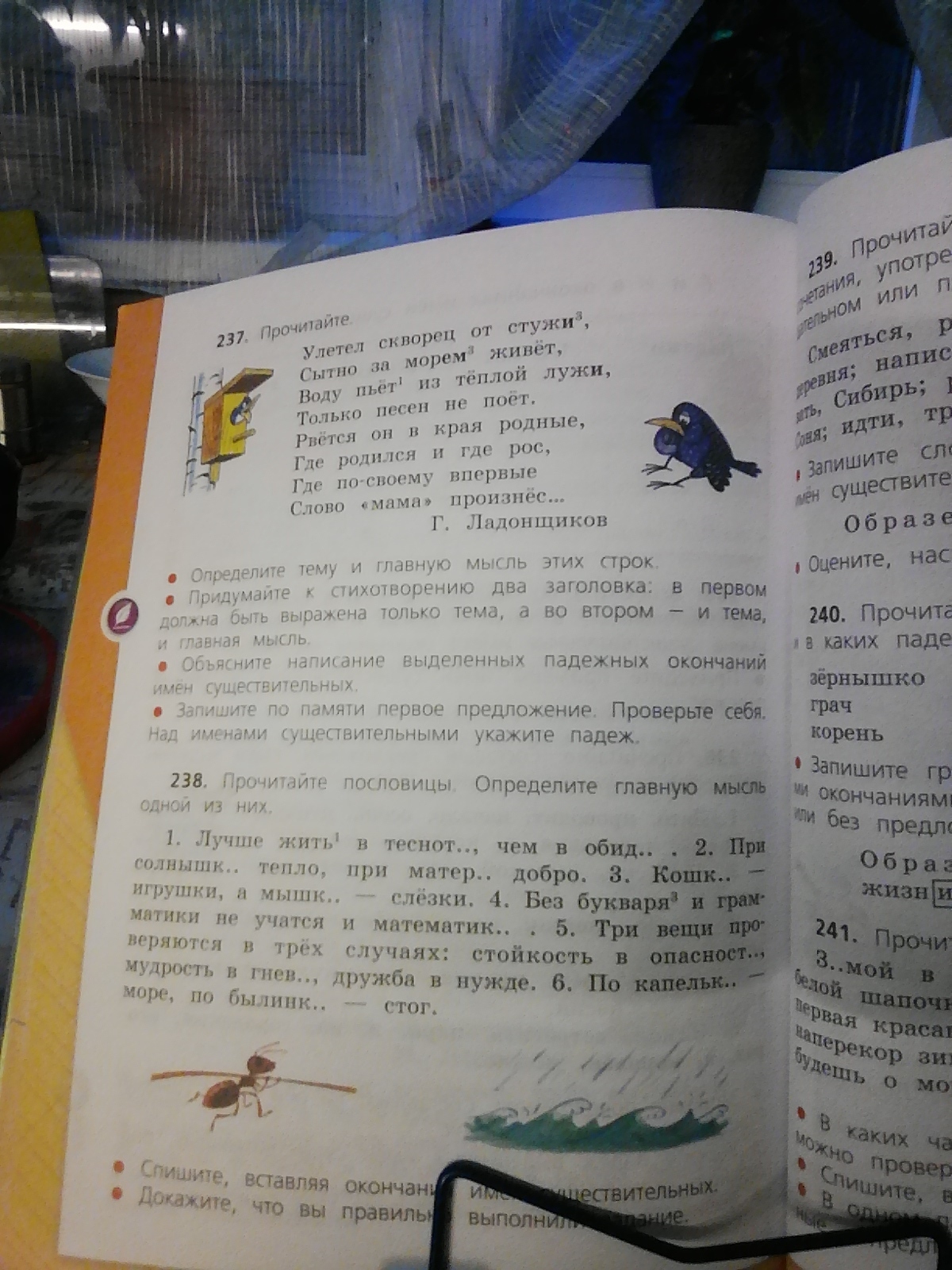 1) Главная мысль этих строк то,что скворец улетел на юг,и скучает по своей семье(маме),родине.
