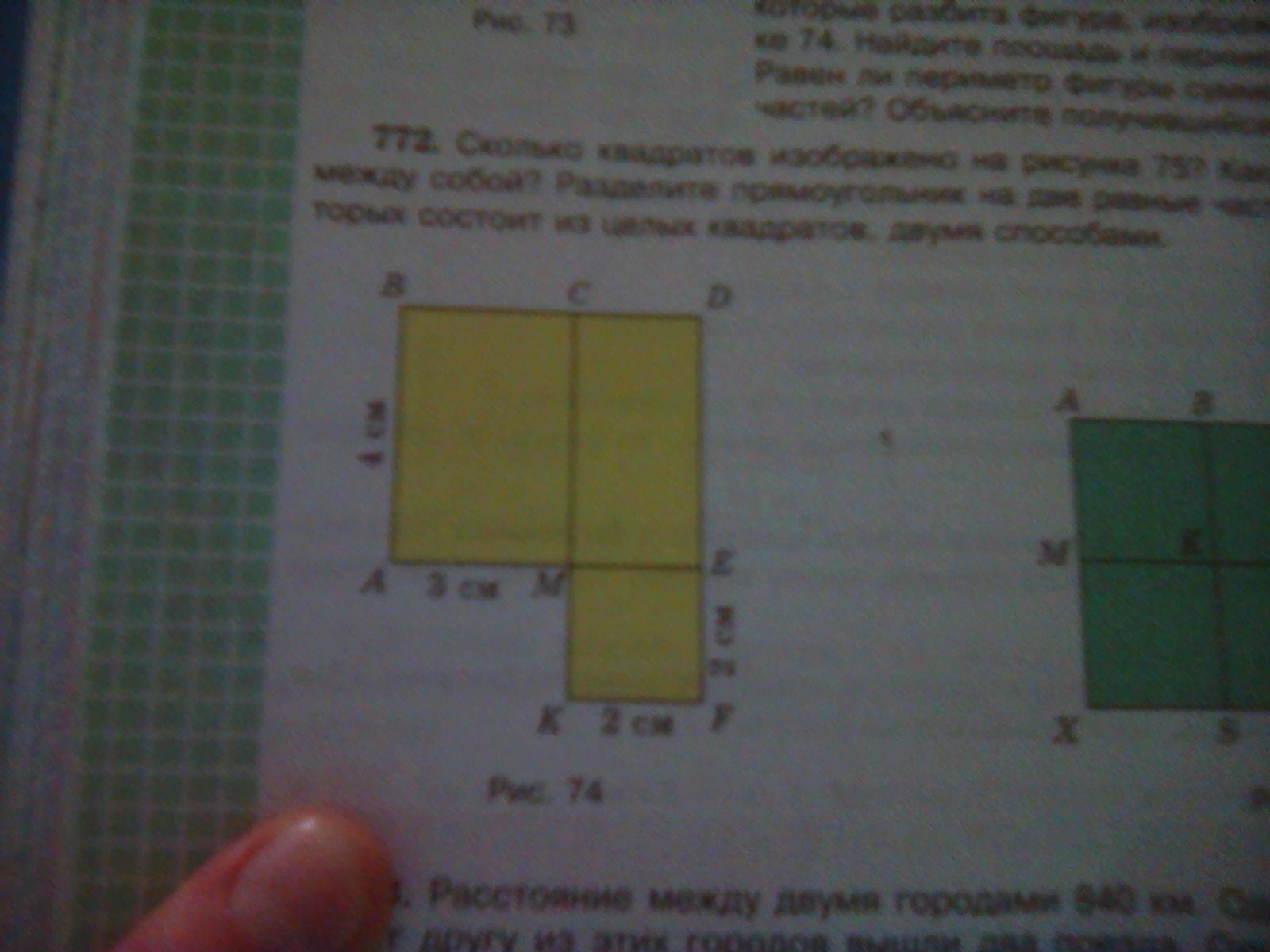 Найдите площади и периметры частей,на которые разбита фигура изображенная на рисунке 74 . Найдите площадь и периметрвсей фигуры сумме периметров её частей ?