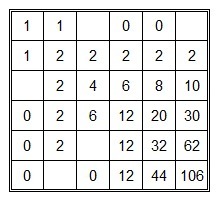 Число путей равно сумме числа путей, ведущих в соседнюю ячейку сверху, и числа путей, ведущих в соседнюю ячейку слева, так как только из них можно попасть в текущую ячейку. В ячейки с золотом поставим нули.