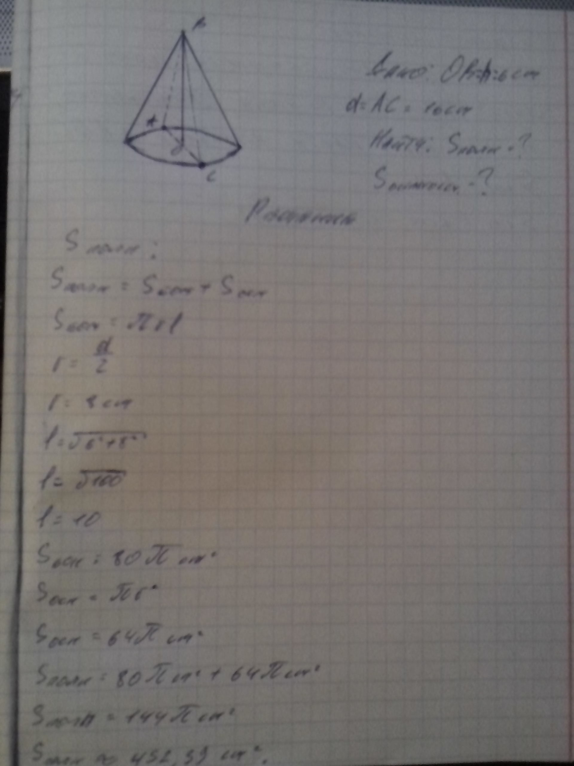 2. Диаметр основания конуса равен 16см, а высота 6см. Найдите площадь полной поверхности и площадь осевого сечения конуса.