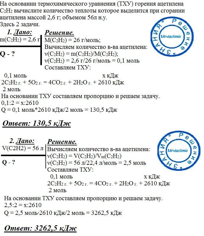 на основании термохимического уравнения горения ацетилена c2h2 вычислите количество теплоты которое выделится при сгорании ацетилена массой 2,6 г объемом 56л н.у.