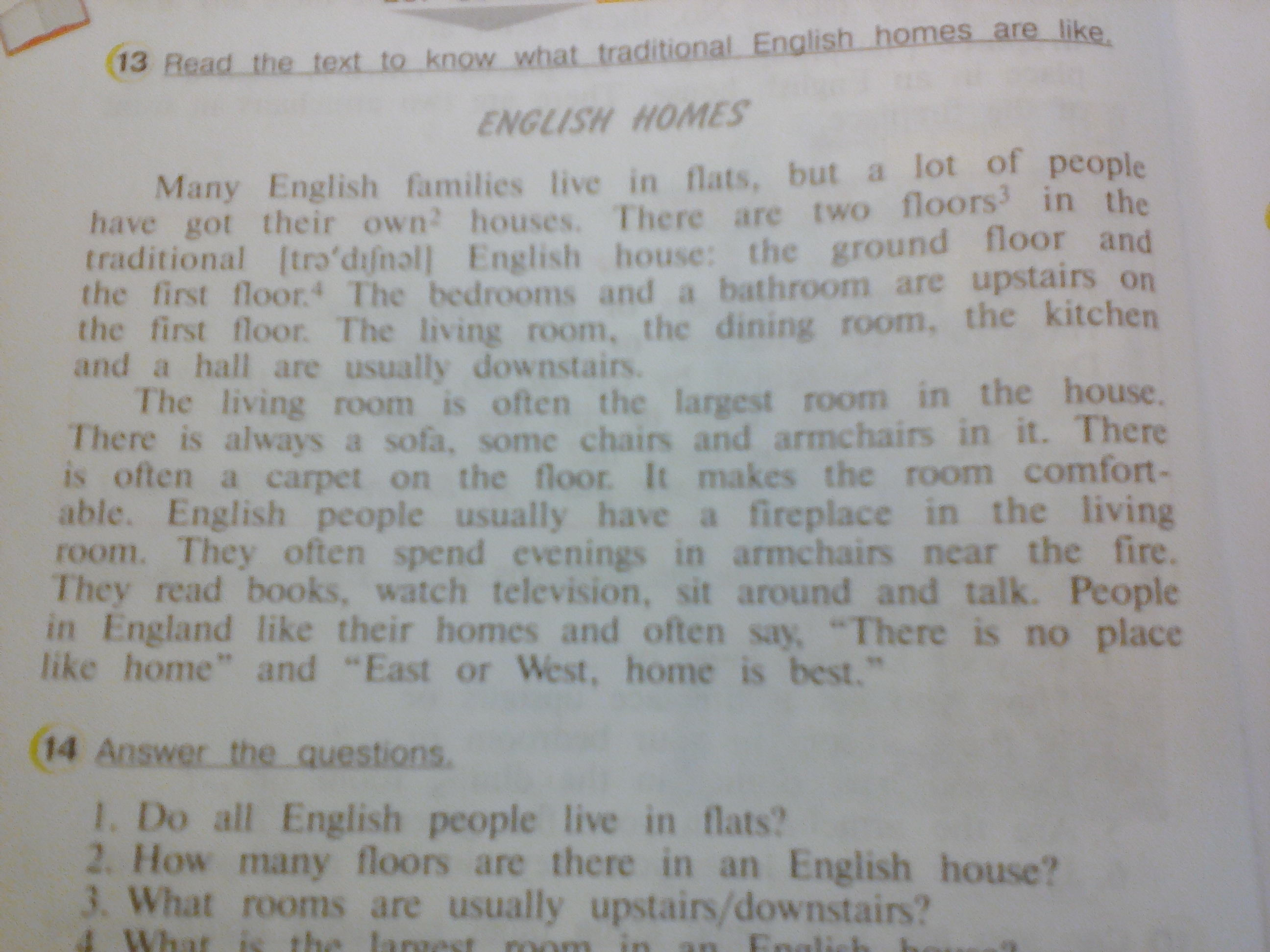 Многие английские семьи живут в квартирах но у многих есть и свои личные дома. В традиционном английском стиле в этих домах есть два этажа: первые этаж ( он как бы на земле находится ) и второй этаж ( но называется как первый....вАнглии все по странному) . Спальная комната и ванная находятся вверх по ступенькам на втором этаже . Гостиная, столовая и кухня обычно находятся на первом этаже
