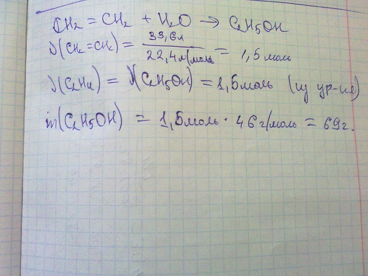 найдем кол-во этена = 33,6/22,4=1,5 моль