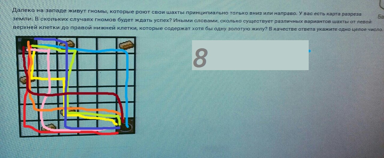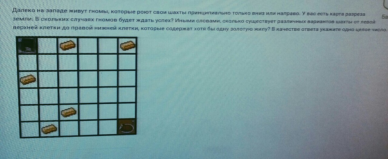 Ну, нужно дойти от верхнего левого угла до нижнего правого. Можно идти только вниз или на право. Спрашивается: сколько путей можно проложить от верхнего левого угла до нижнего правого угла, "пройдясь" хотя бы по одному золотому слитку.